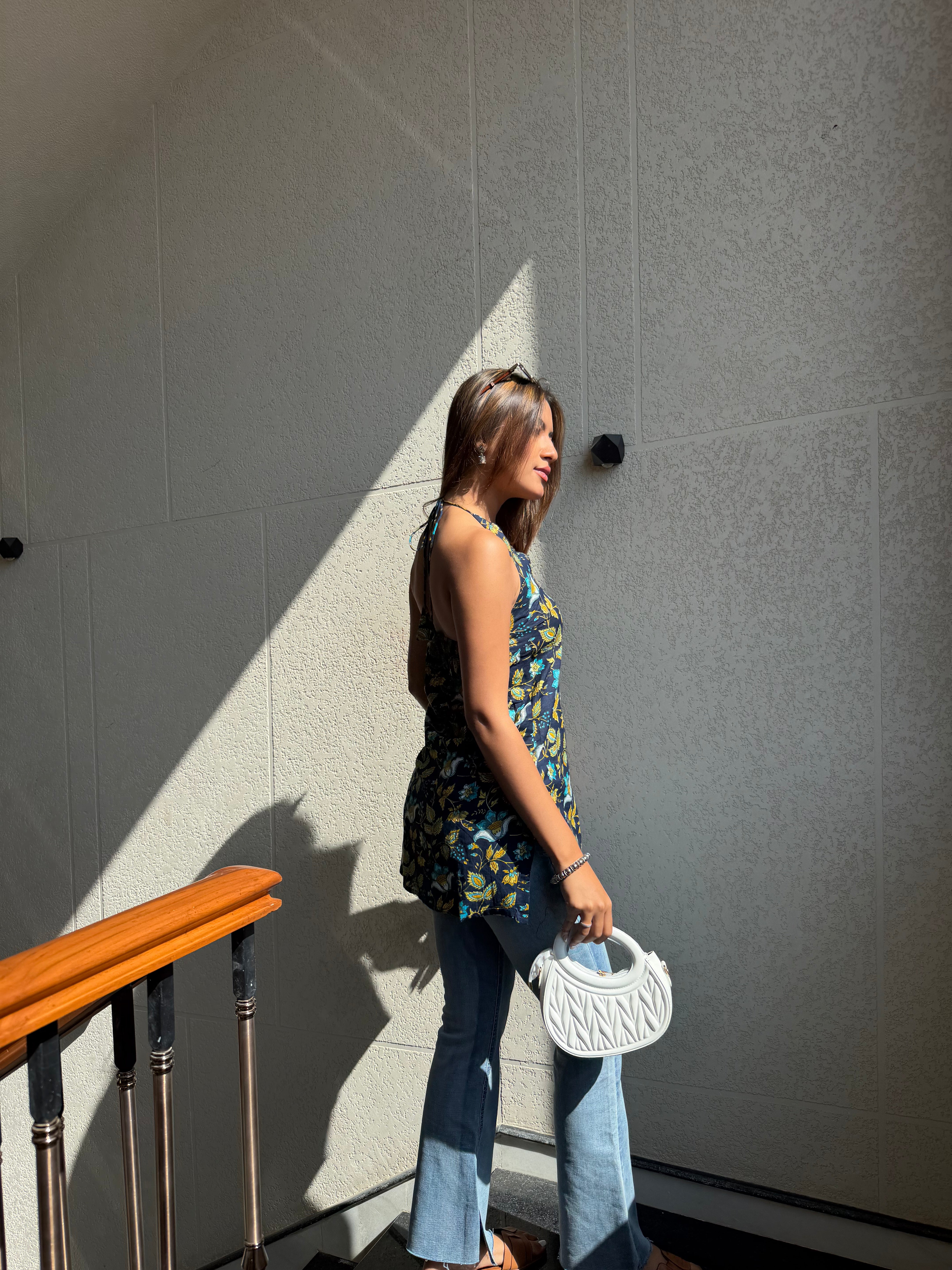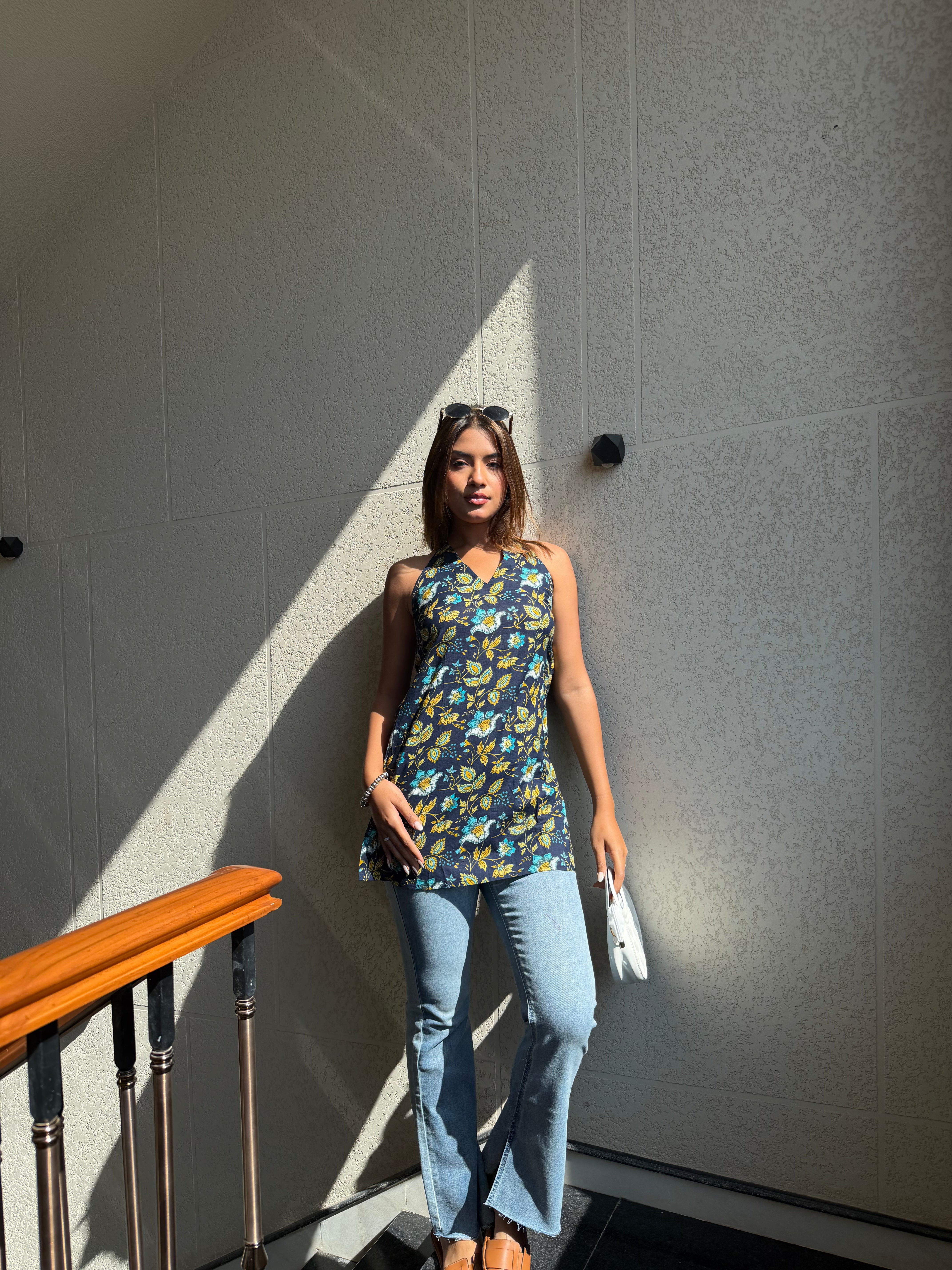 "Women’s 100% Cotton Printed Halter Neck Short Kurti – Back Elastic, Side Slits, Tie-Up Neck | Casual Summer Wear "