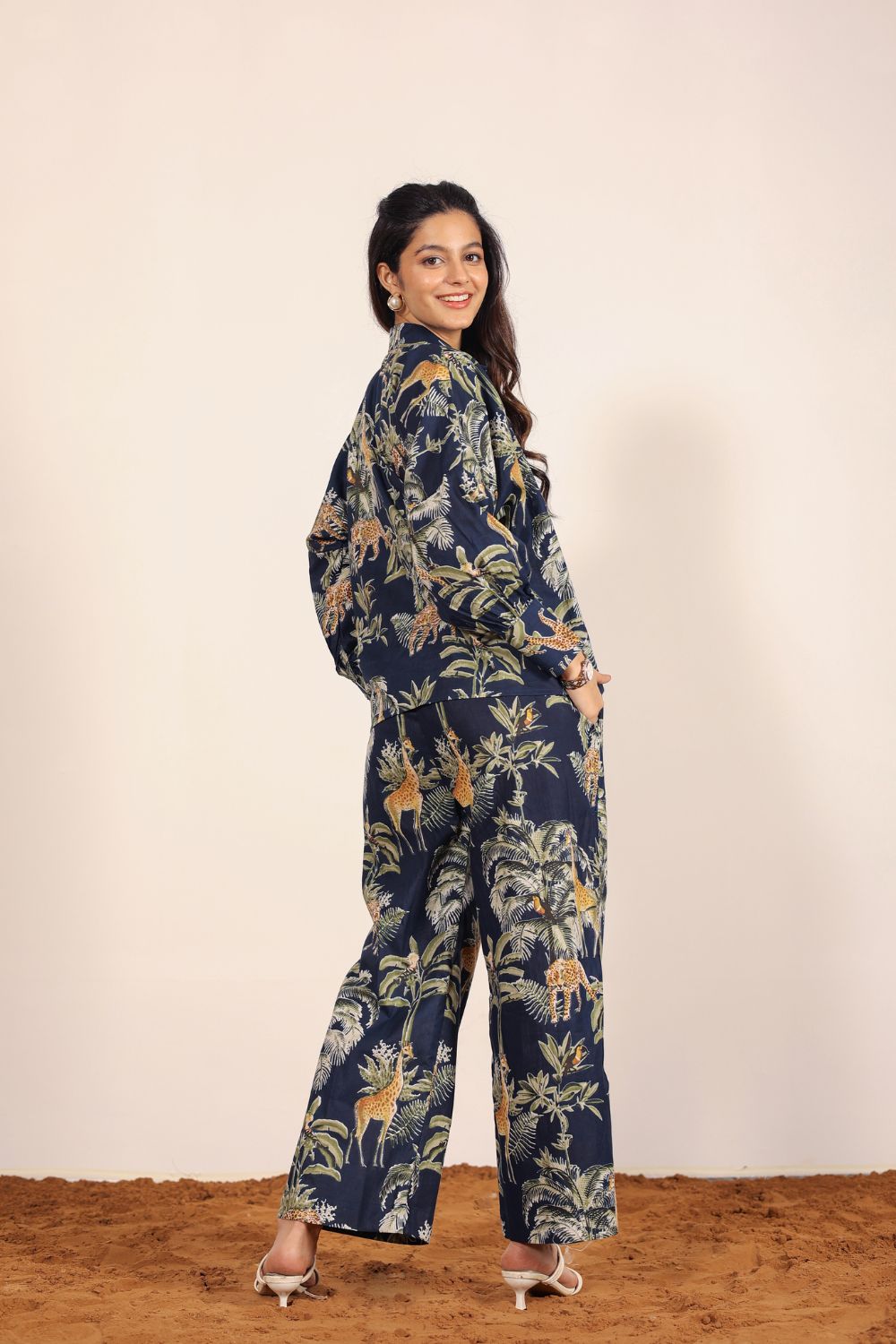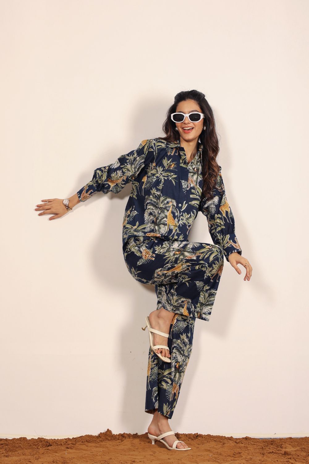 - Evening Chic: Choose a structured Designer Co-Ord Set in a bold print with block heels and statement earrings.