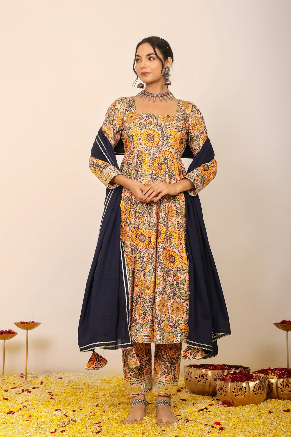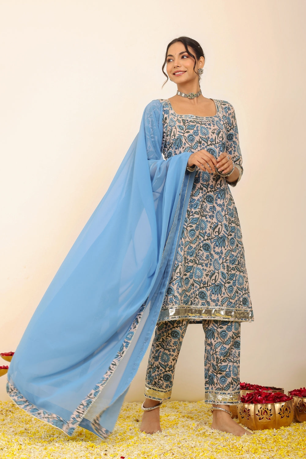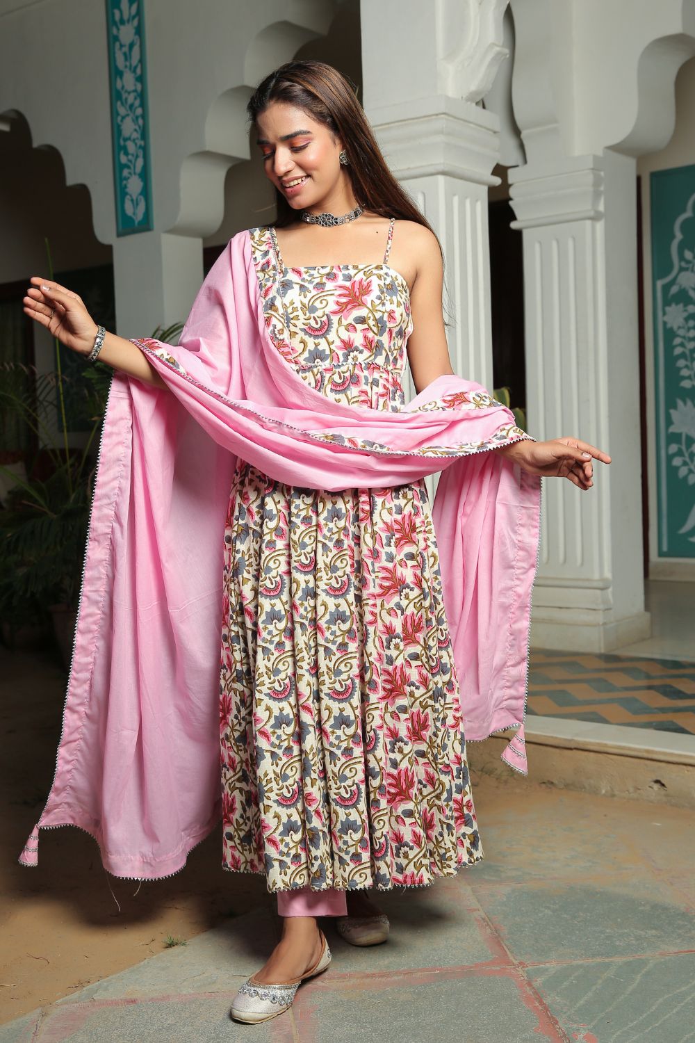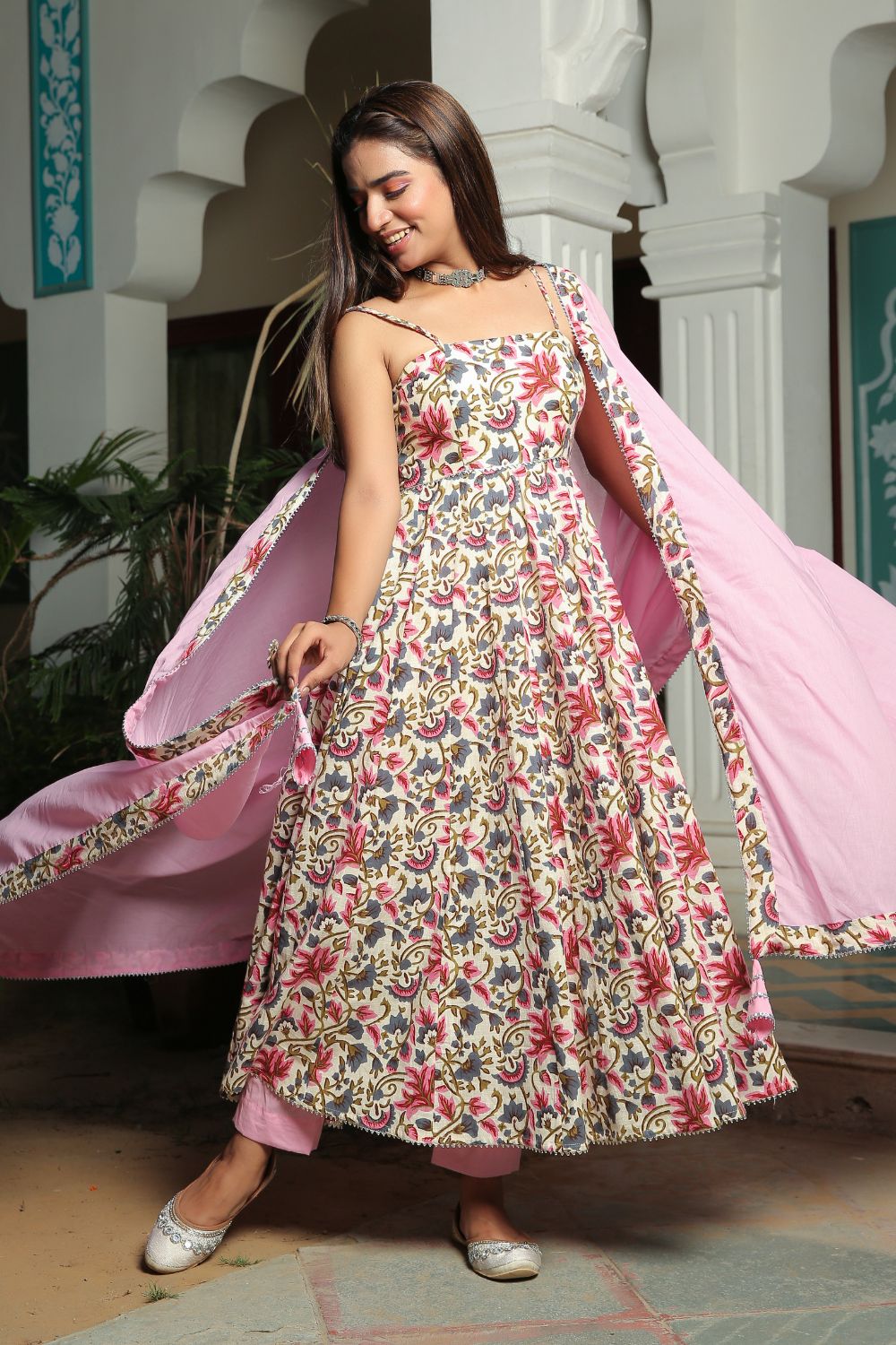 Make a grand entrance in our beautifully tailored Anarkali suit sets. Characterized by their flared silhouettes and regal charm, these suits are ideal for weddings, parties, or any time you want to feel extra special. Choose from soft floral patterns, rich solid tones, or classic ivory hues that pair beautifully with dupattas crafted from organza or cotton voile.