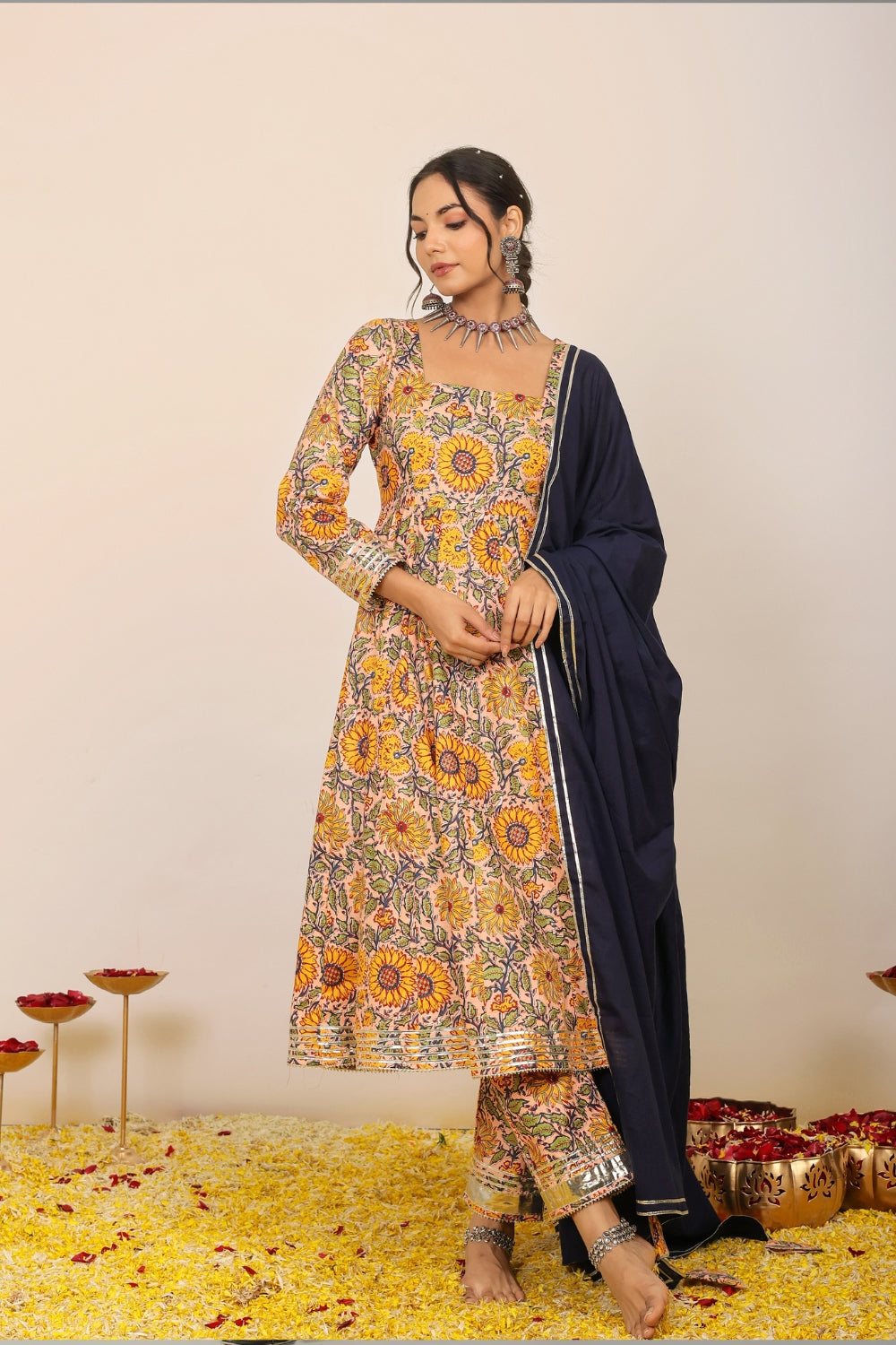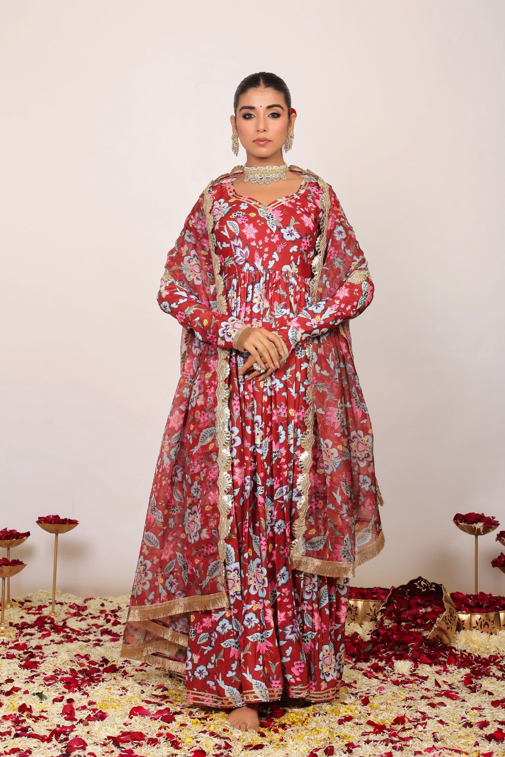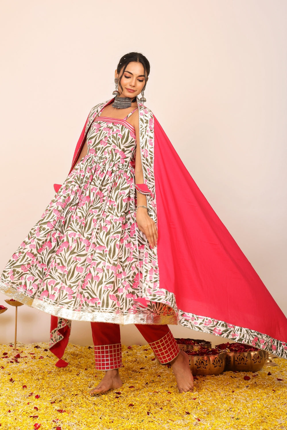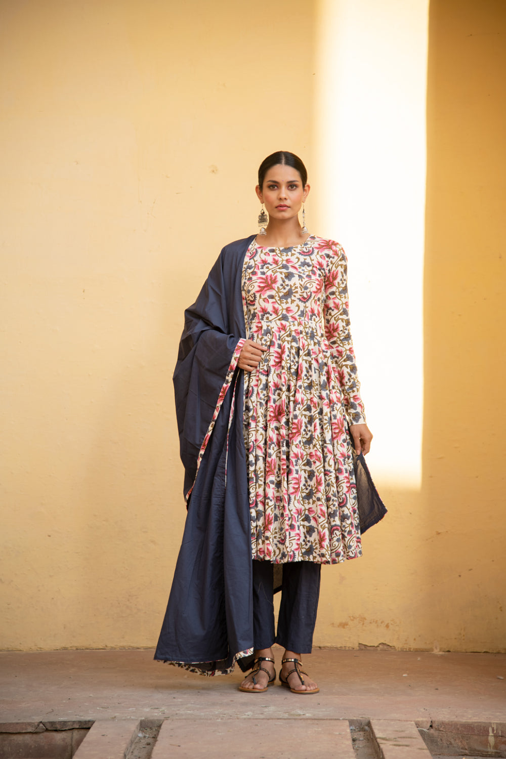 Make a grand entrance in our beautifully tailored Anarkali suit sets. Characterized by their flared silhouettes and regal charm, these suits are ideal for weddings, parties, or any time you want to feel extra special. Choose from soft floral patterns, rich solid tones, or classic ivory hues that pair beautifully with dupattas crafted from organza or cotton voile.