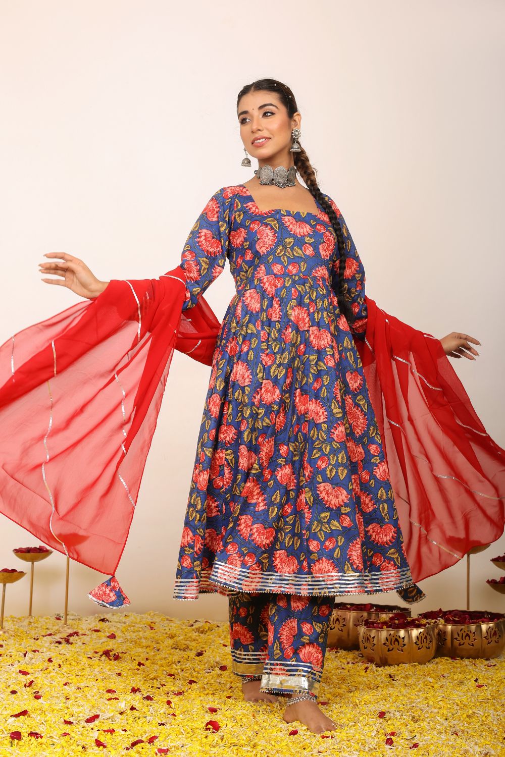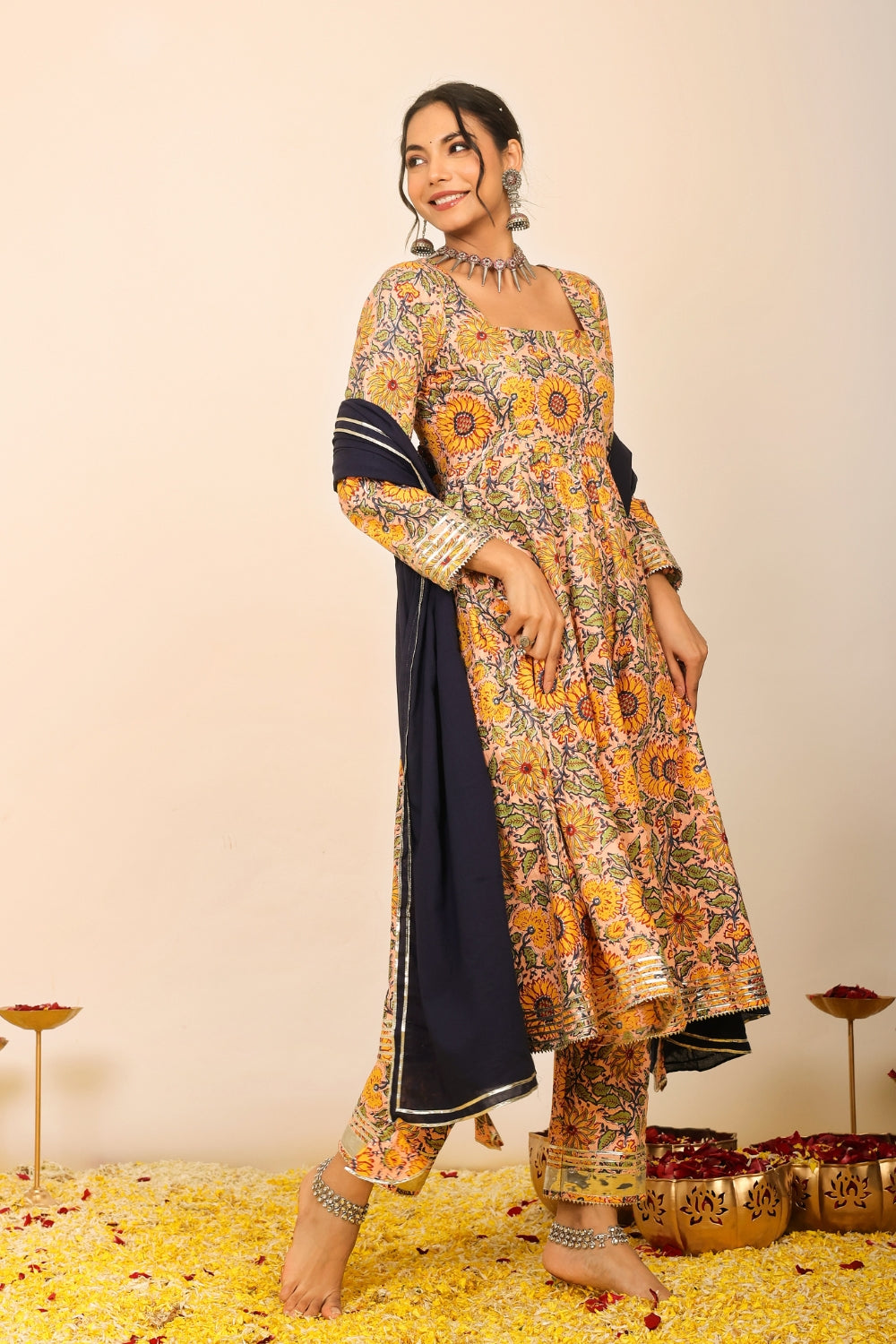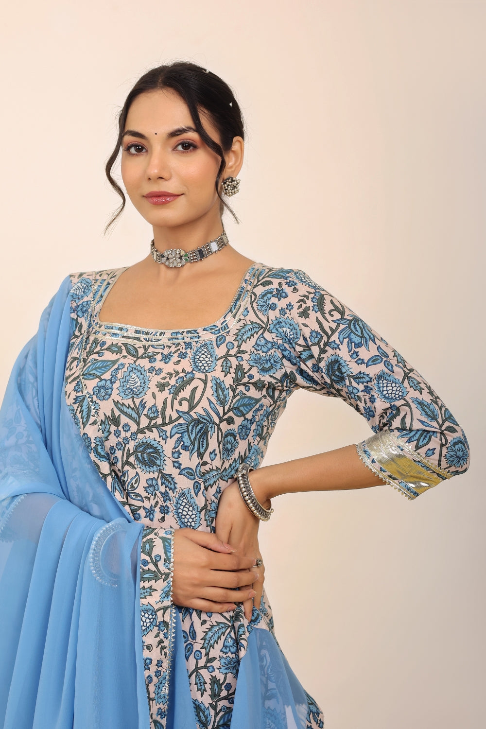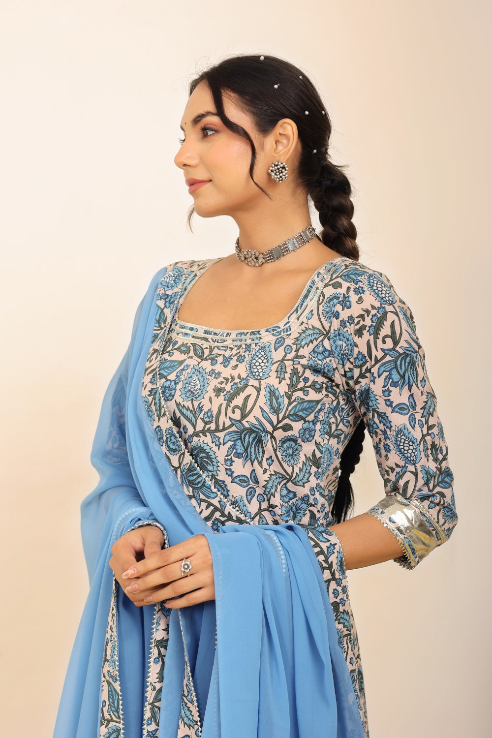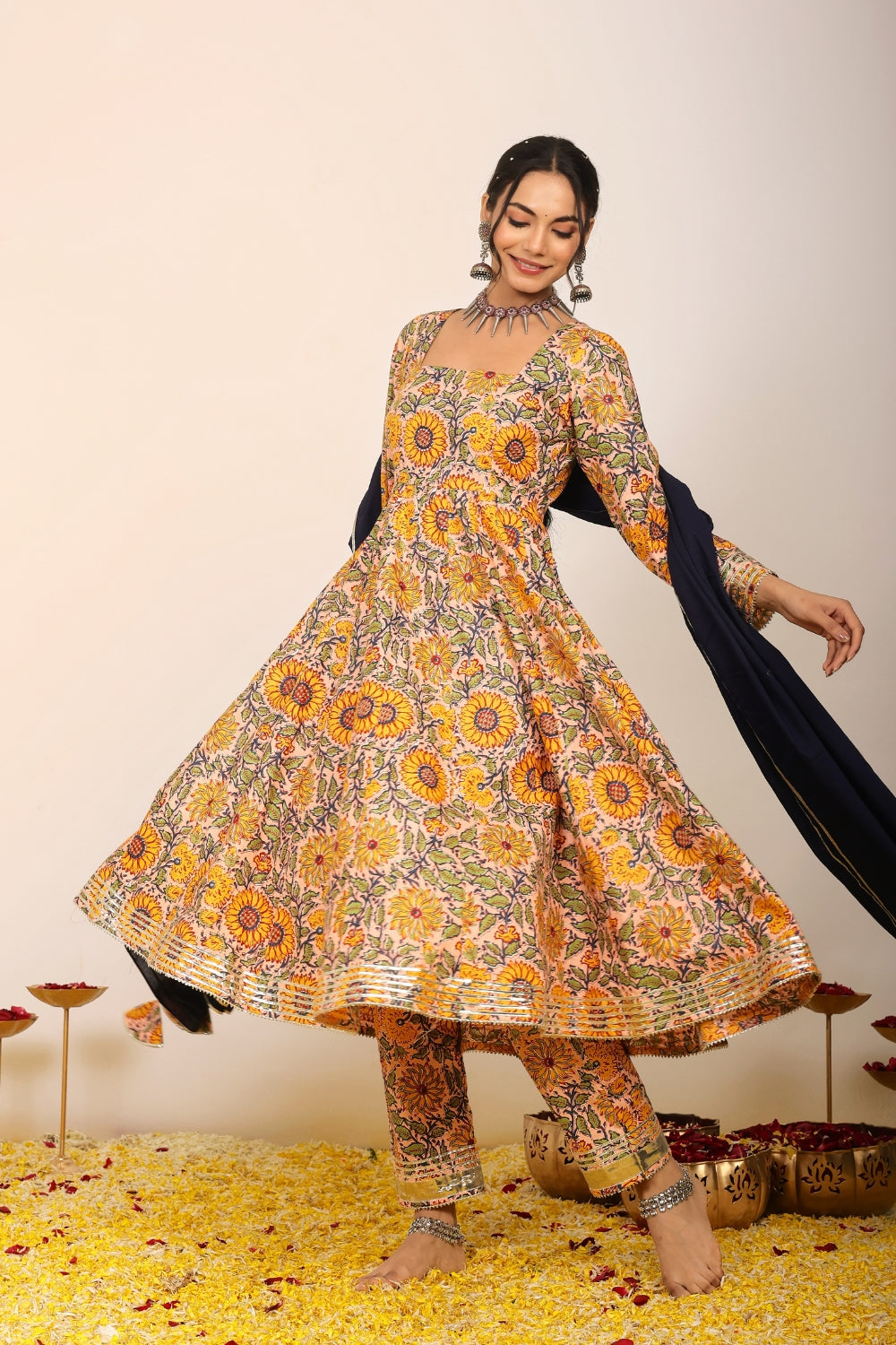 Make a grand entrance in our beautifully tailored Anarkali suit sets. Characterized by their flared silhouettes and regal charm, these suits are ideal for weddings, parties, or any time you want to feel extra special. Choose from soft floral patterns, rich solid tones, or classic ivory hues that pair beautifully with dupattas crafted from organza or cotton voile.