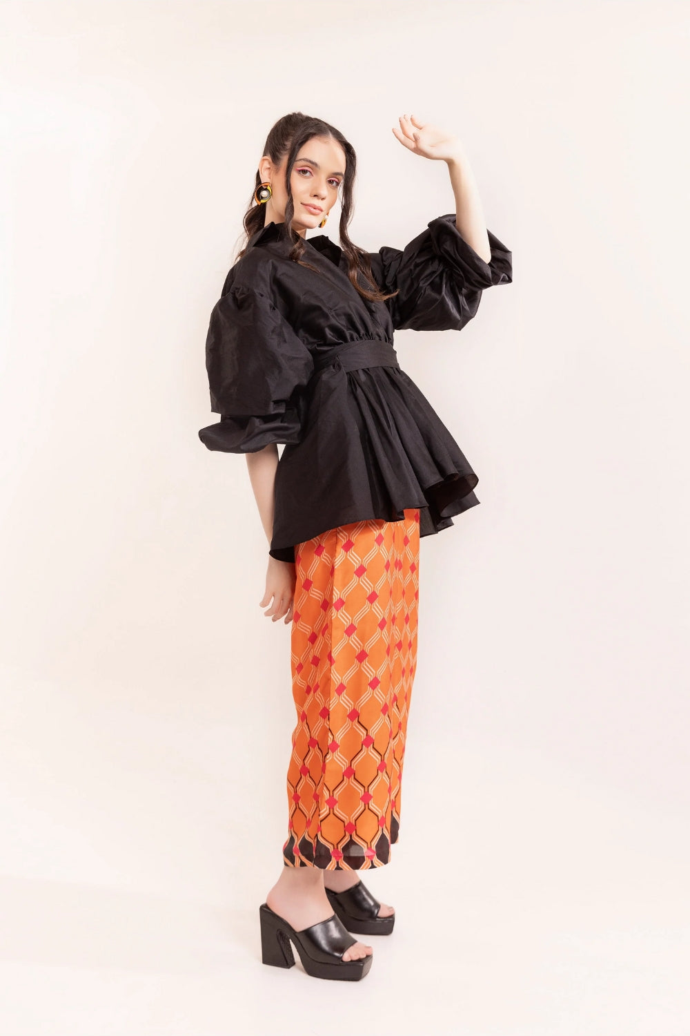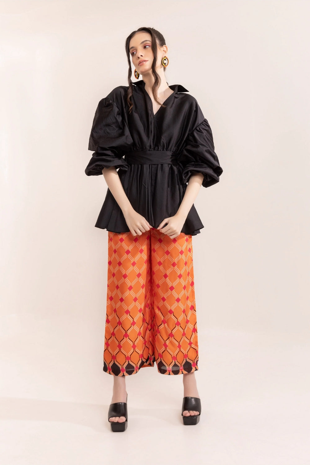 - Style printed trousers with solid-coloured tops to balance the pattern.