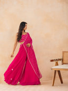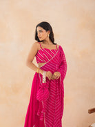 Radiate festive elegance in this vibrant fuchsia pink leheriya drape cape set, crafted in soft georgette with graceful flow and festive flair. The ensemble features a lace-embellished choli, a statement draped cape, and flared palazzo pants, blending traditional leheriya artistry with contemporary Indo-Western styling.