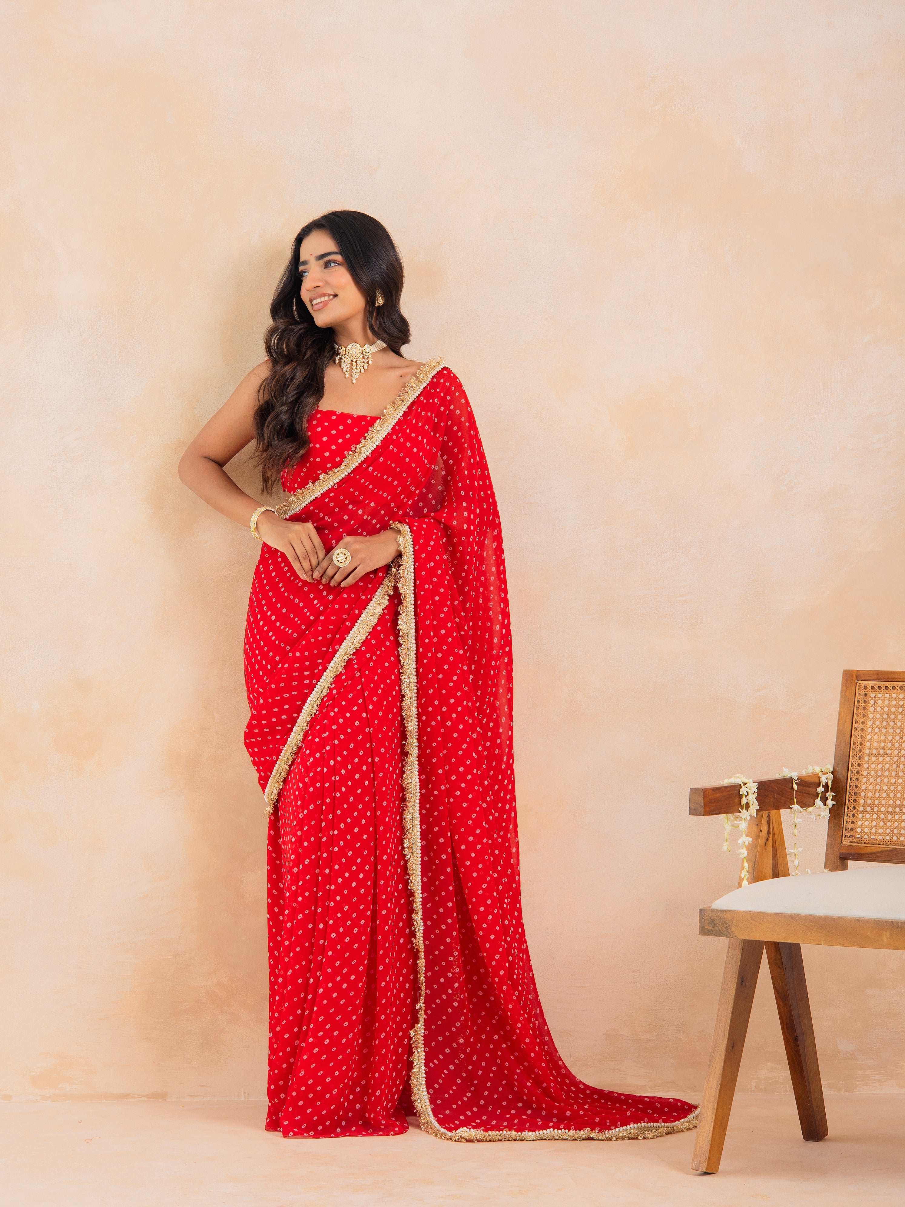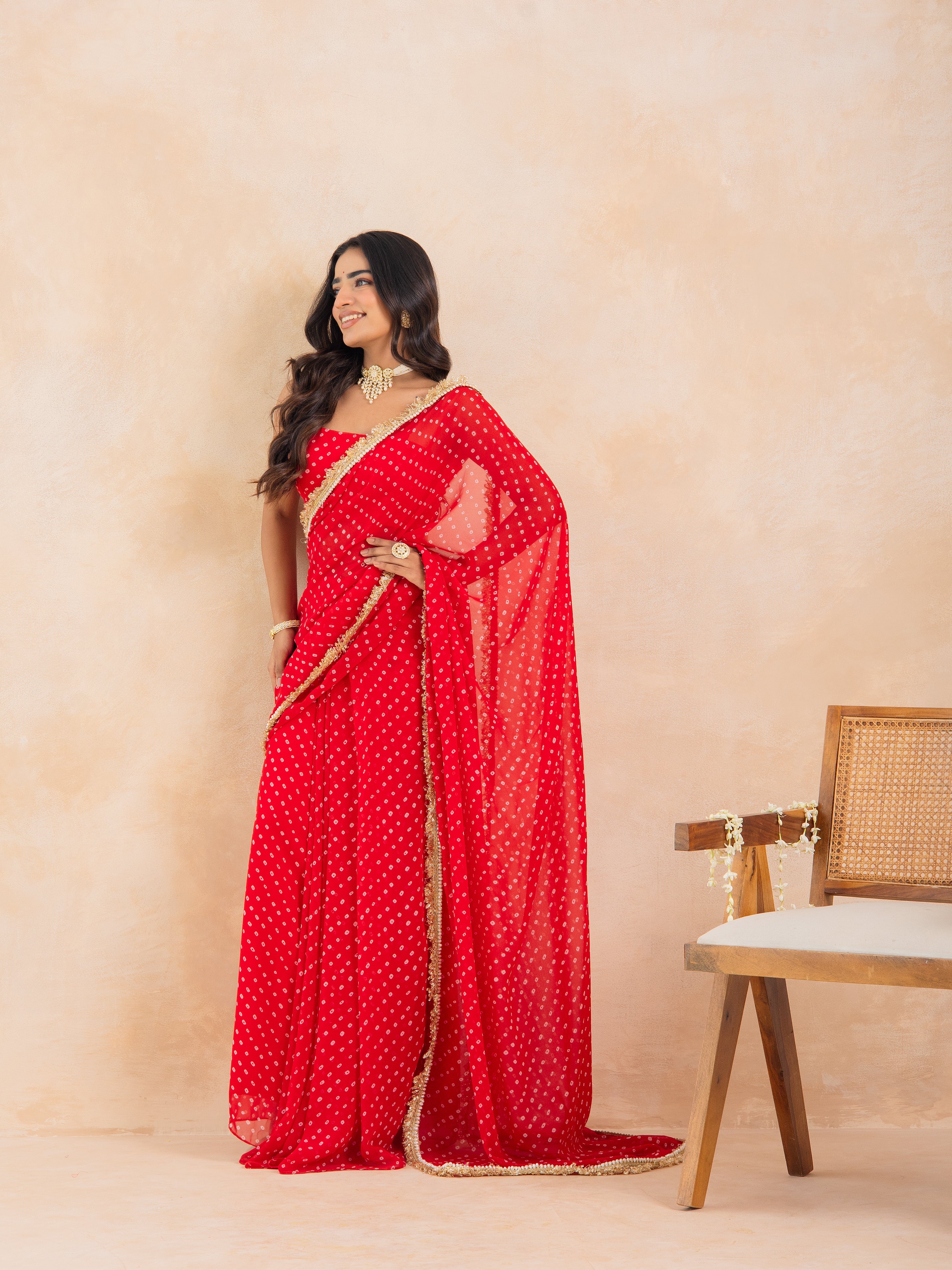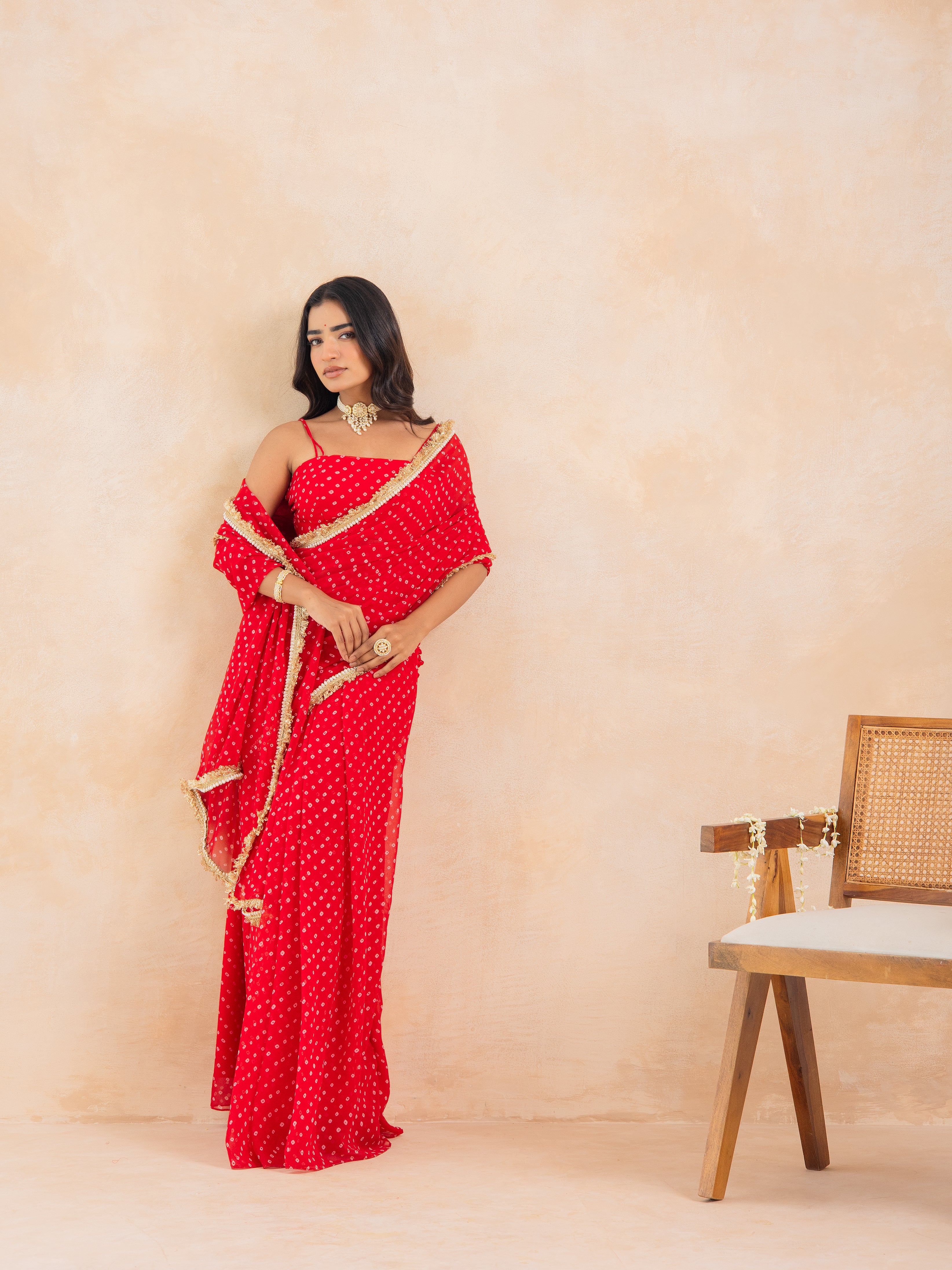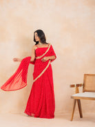Make a timeless statement with Aarza, a stunning red Bandhej pre-draped saree that beautifully merges tradition with effortless modernity. Crafted in flowy georgette, this ensemble features a padded blouse for a structured fit and a lace-detailed drape that adds a delicate festive shimmer.