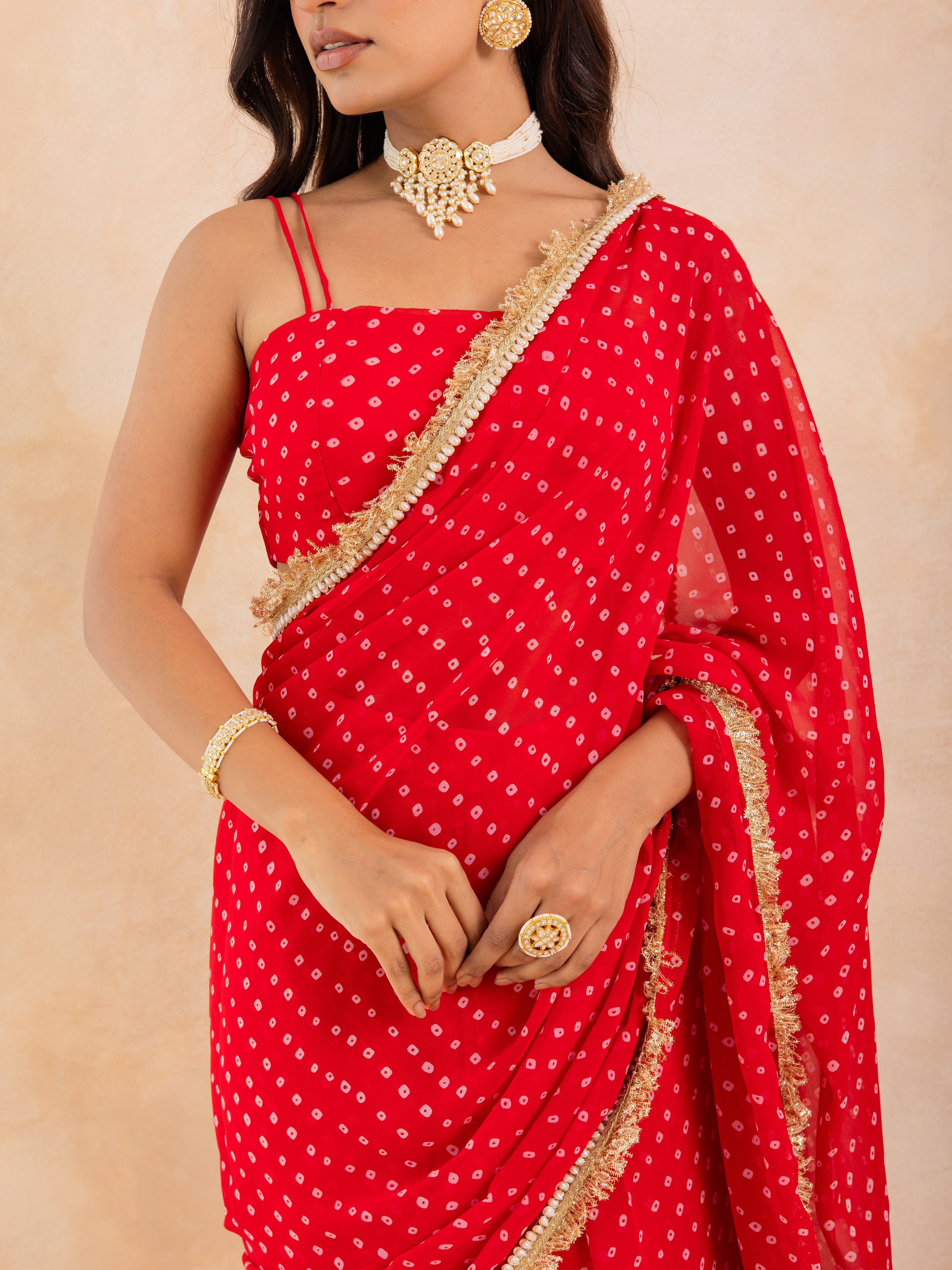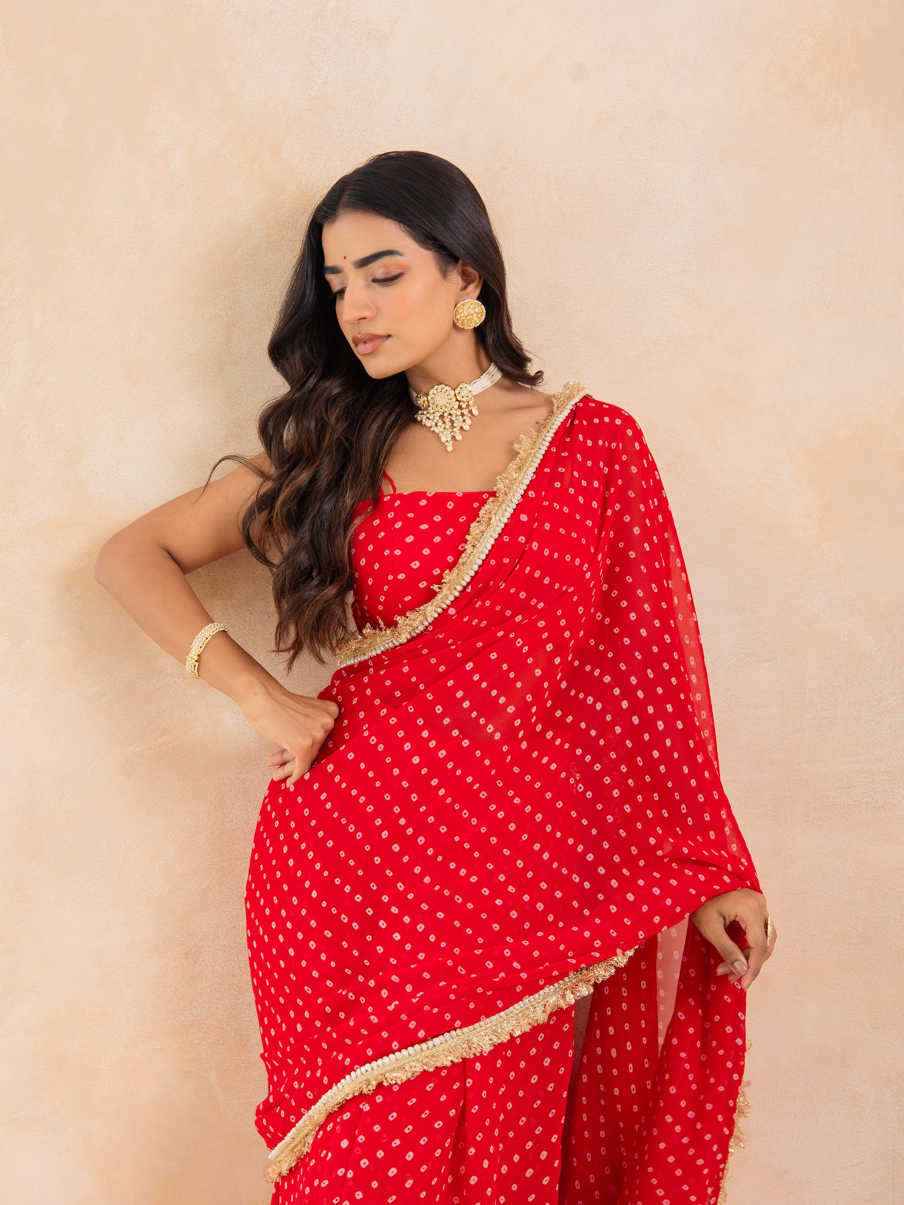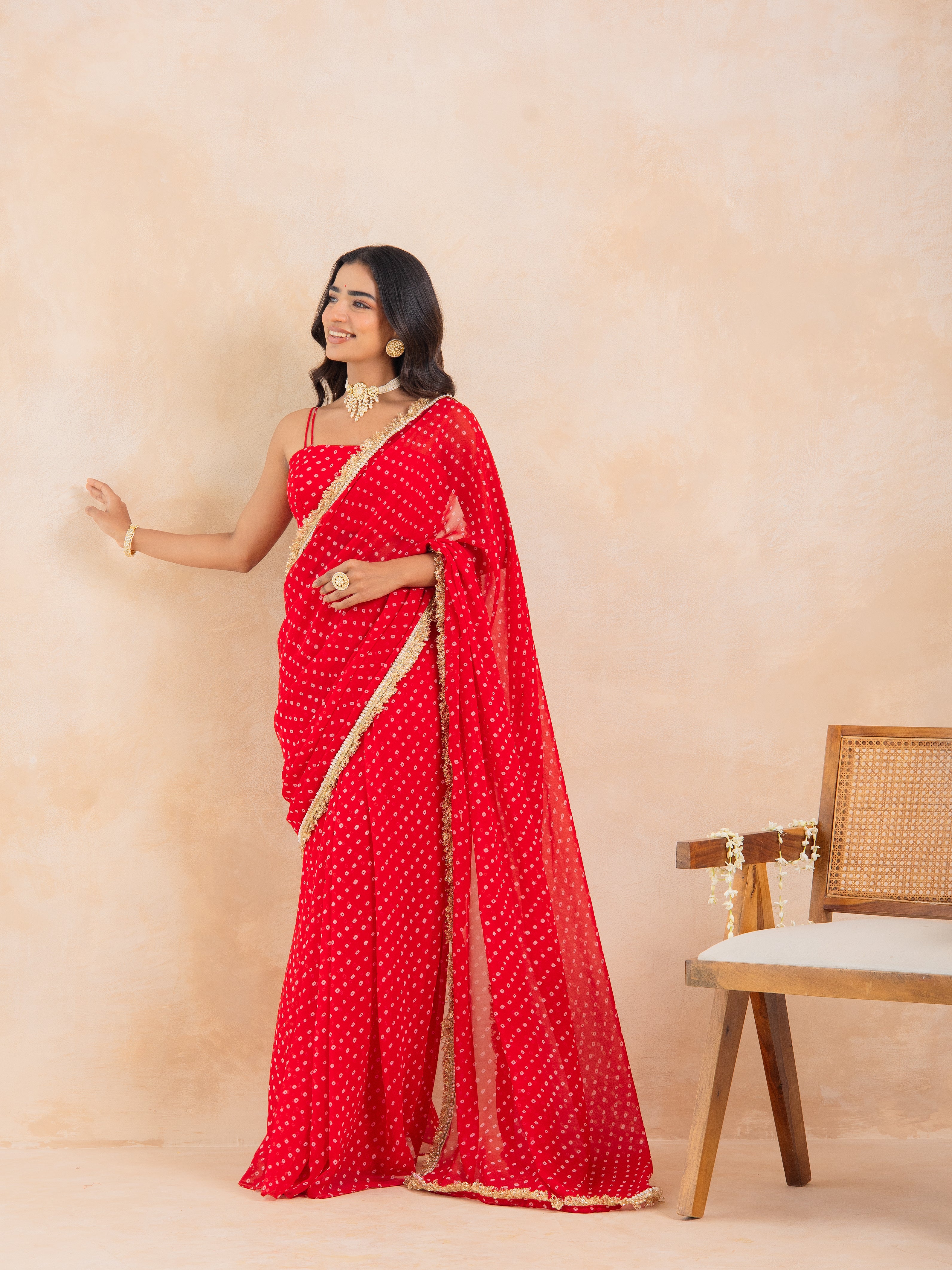 Make a timeless statement with Aarza, a stunning red Bandhej pre-draped saree that beautifully merges tradition with effortless modernity. Crafted in flowy georgette, this ensemble features a padded blouse for a structured fit and a lace-detailed drape that adds a delicate festive shimmer.