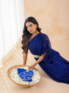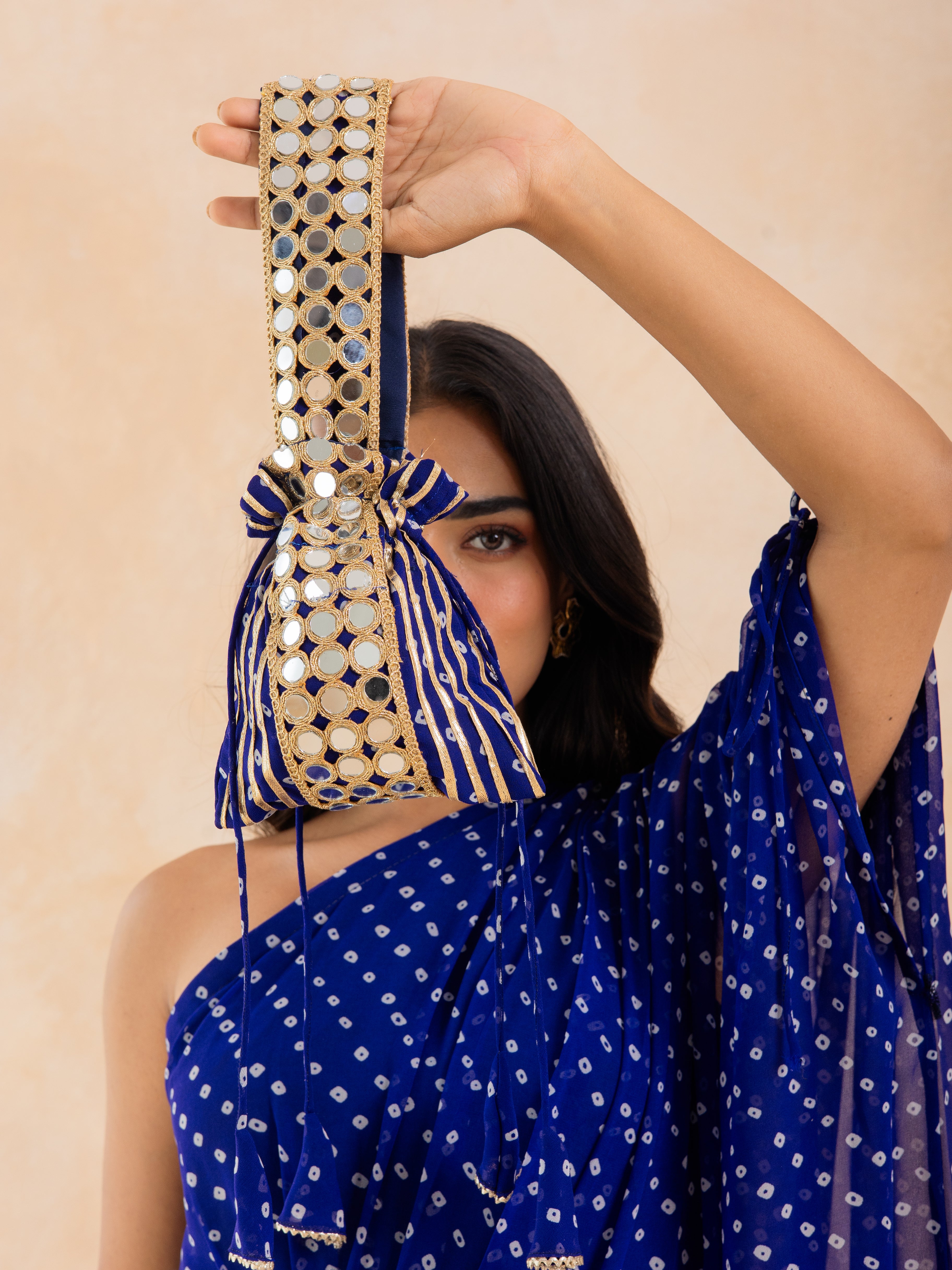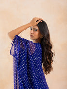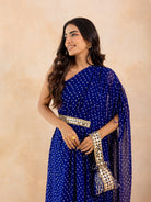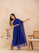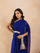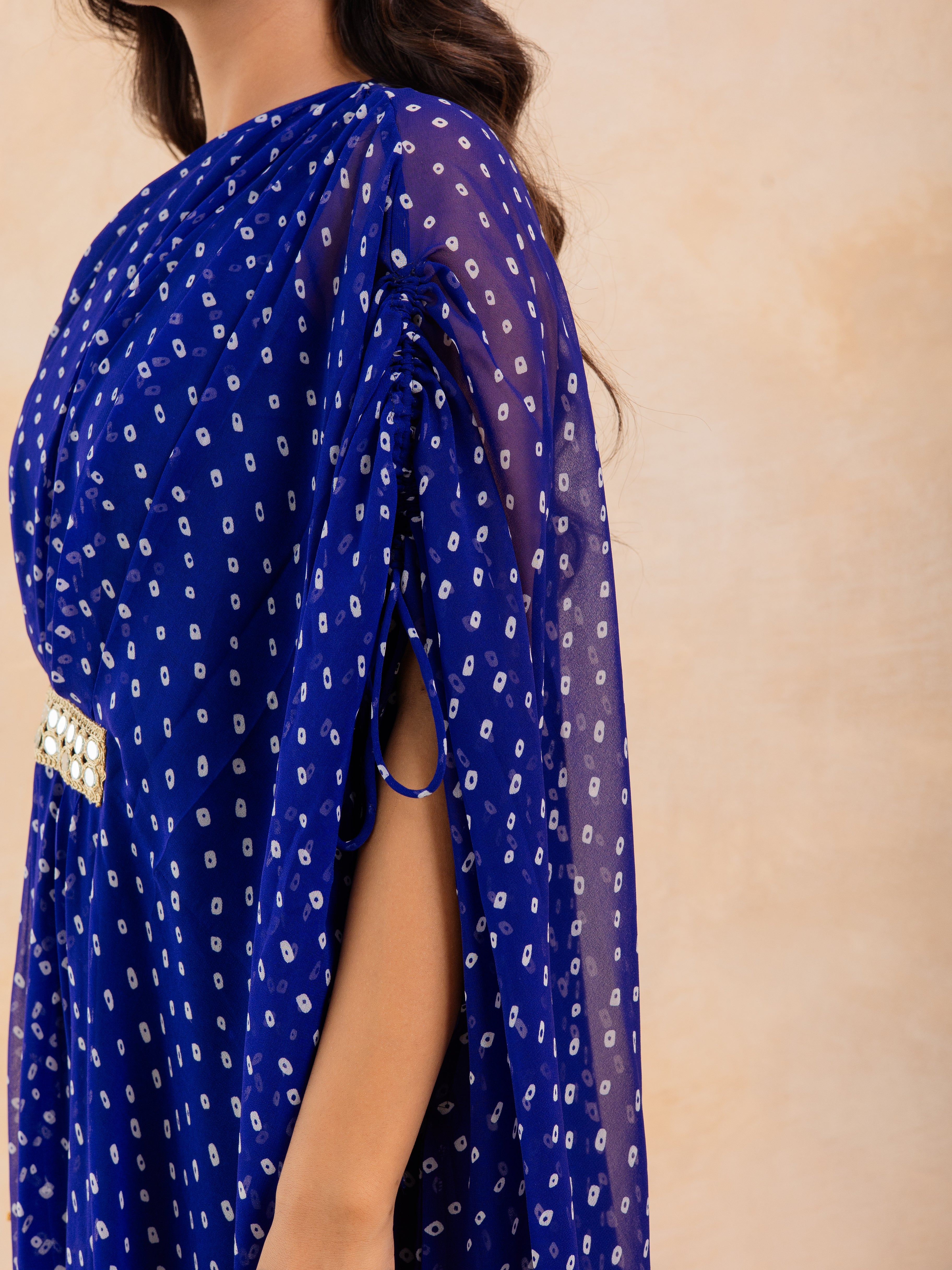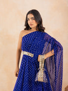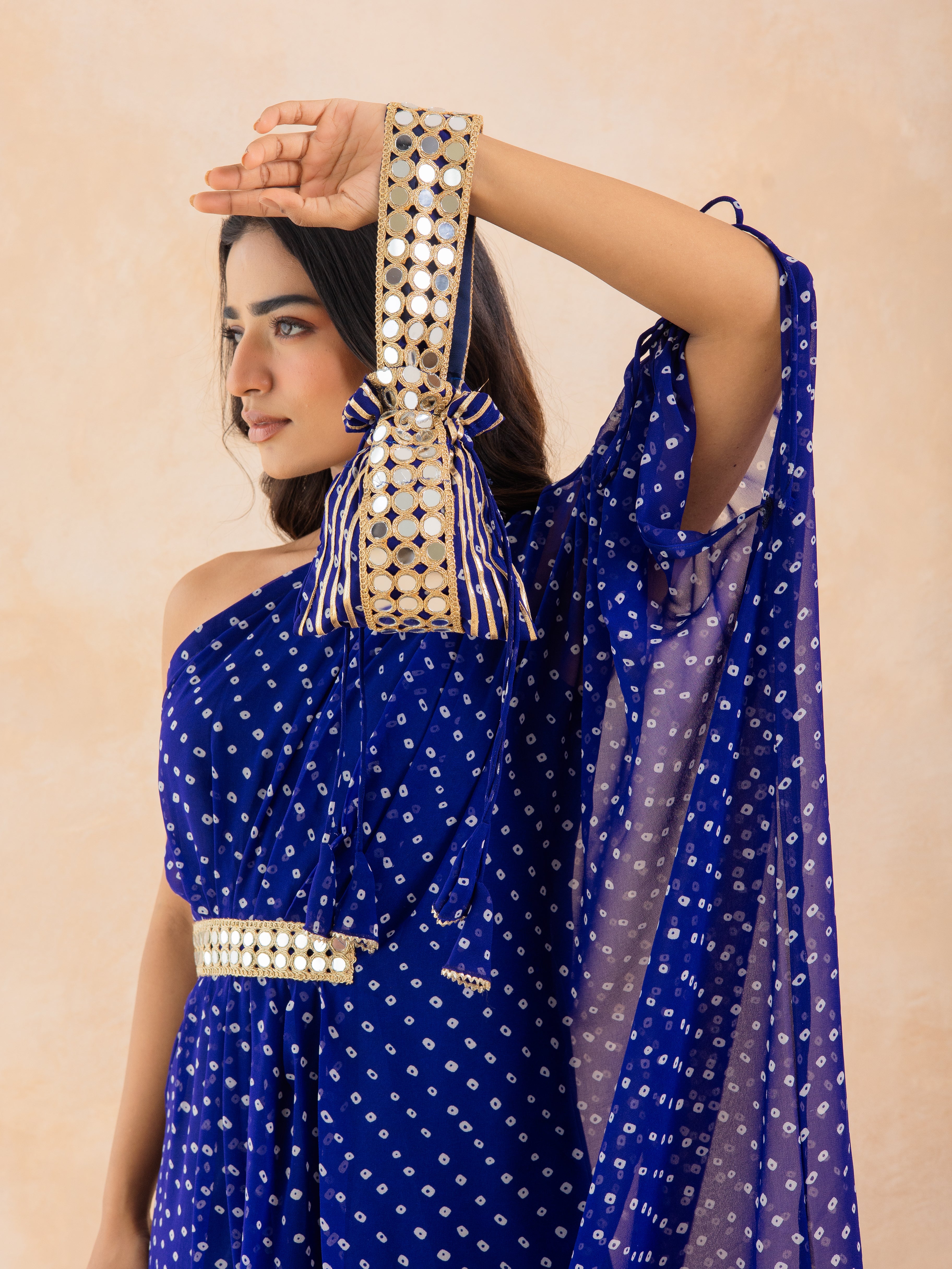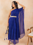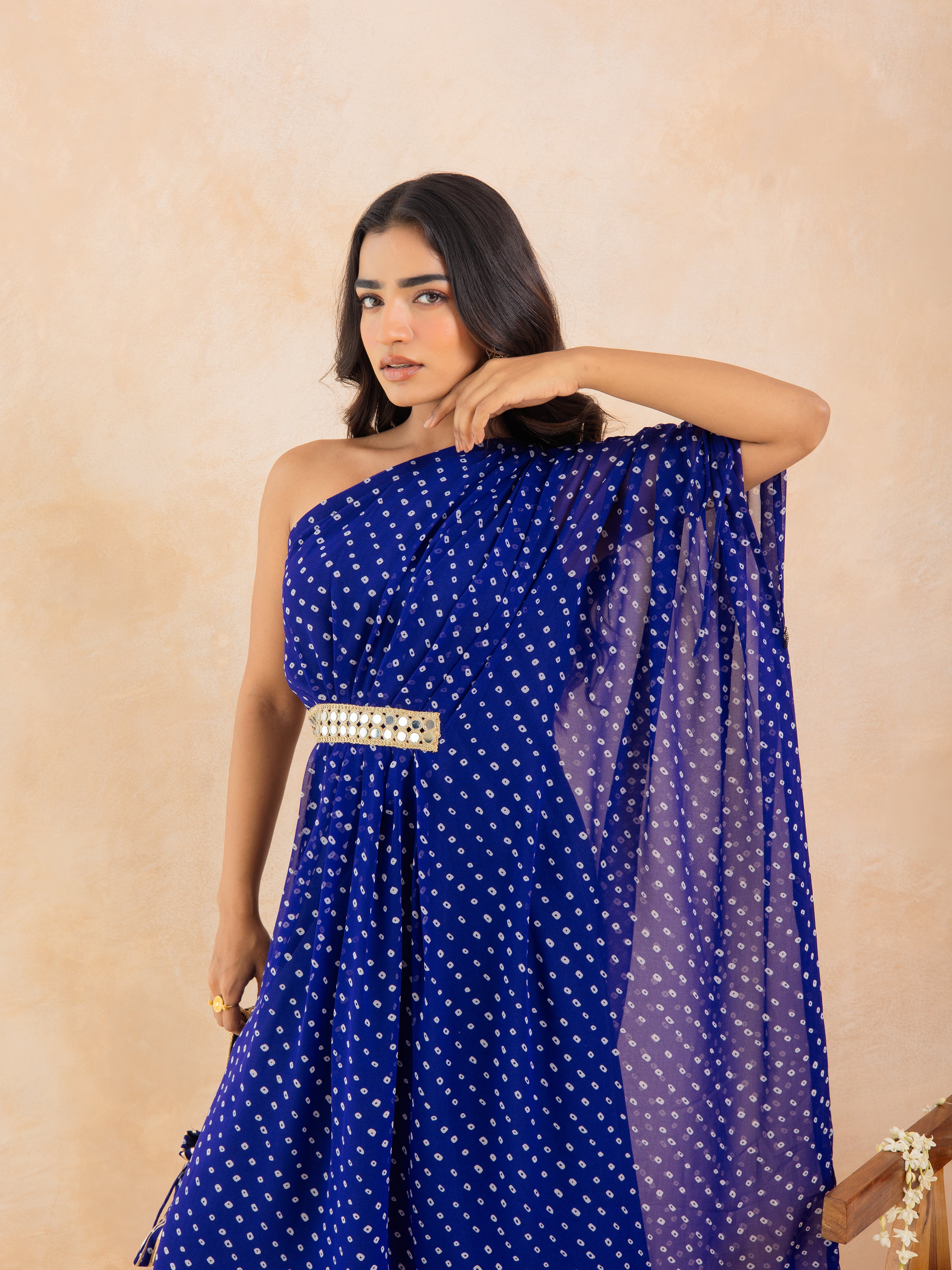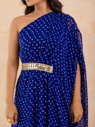 ADYA-Blue Bandhej One-Shoulder Kaftan with Mirror Embellished Waist Belt