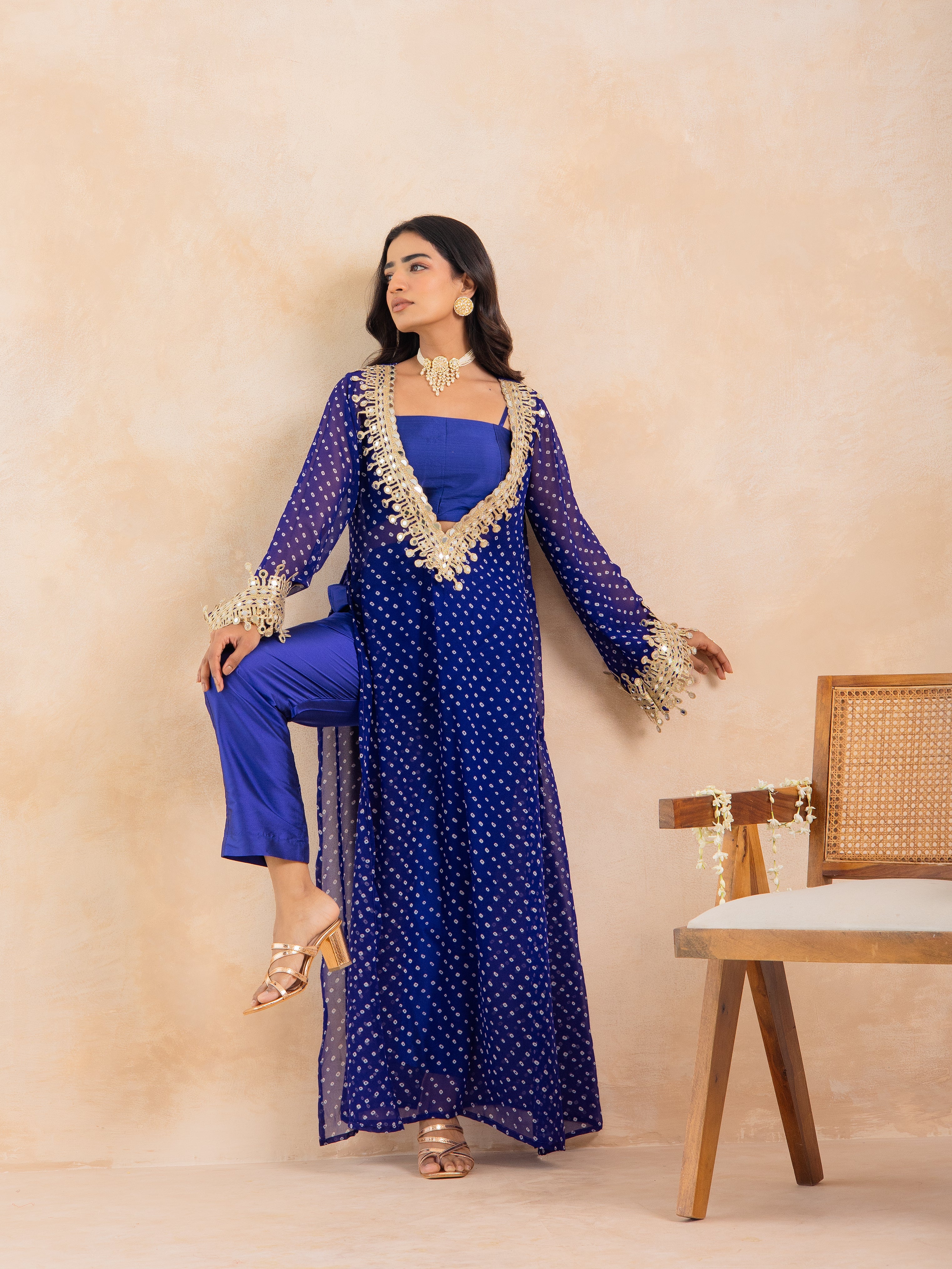 Drape yourself in festive elegance with Aira, a captivating blue Bandhej 3-piece set that perfectly balances tradition and modern style. The set features a heavily mirror-embroidered long kurta, a padded and lined choli, and flared pants, creating a graceful yet contemporary silhouette.