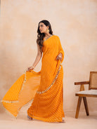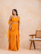 Playful, versatile, and full of festive energy — Inaya is a statement yellow leheriya multi-styling set designed to be worn your way. Crafted in flowy georgette, this 3-piece set features a padded blouse, a flared slit skirt, and a 2-meter detachable dupatta, allowing you to style it as a lehenga, a saree, or a skirt-and-choli ensemble.