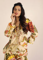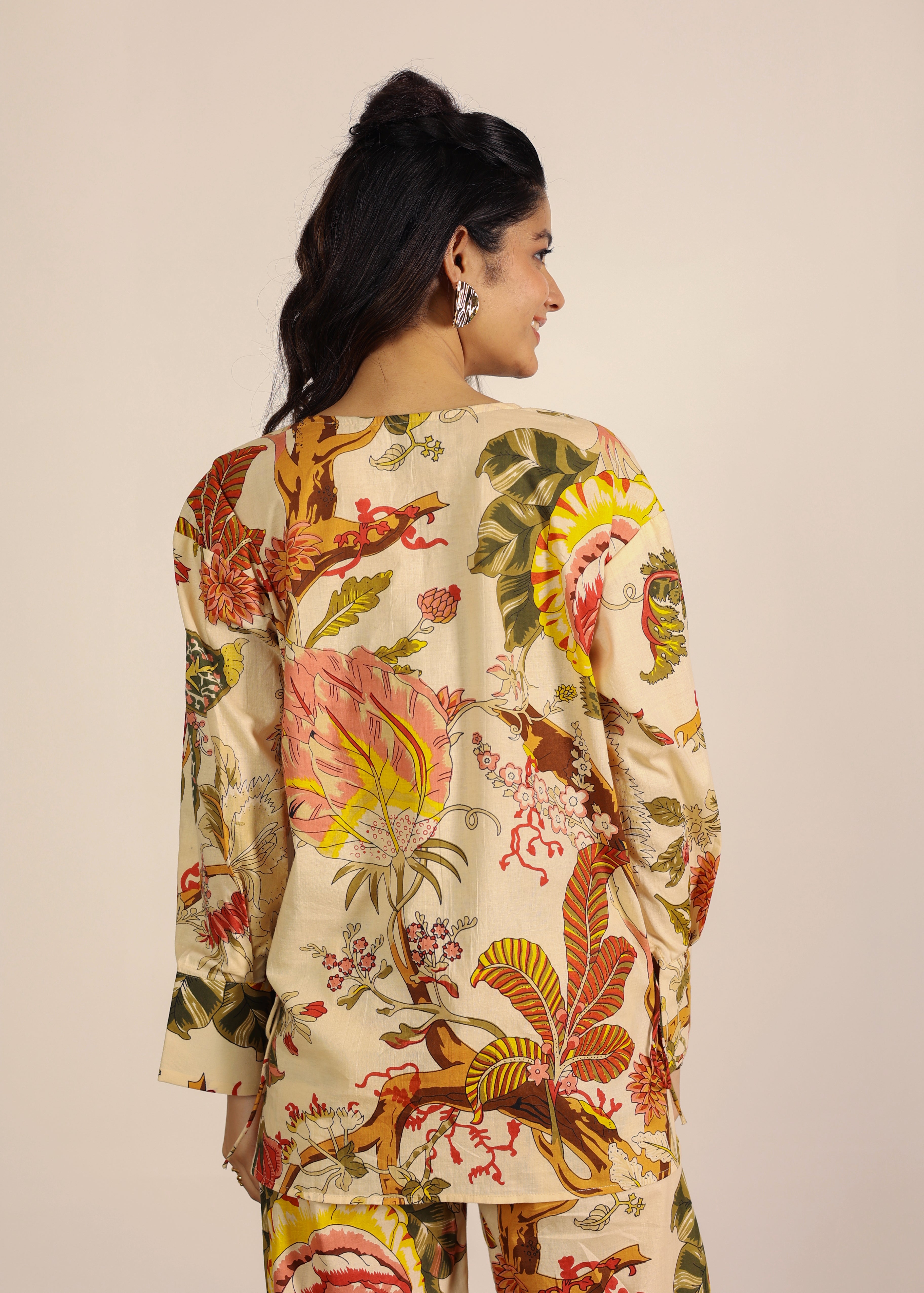 Beige and Multi Floral 100% Cotton V-Neck Kurta Style Work Wear Relaxed Tops
