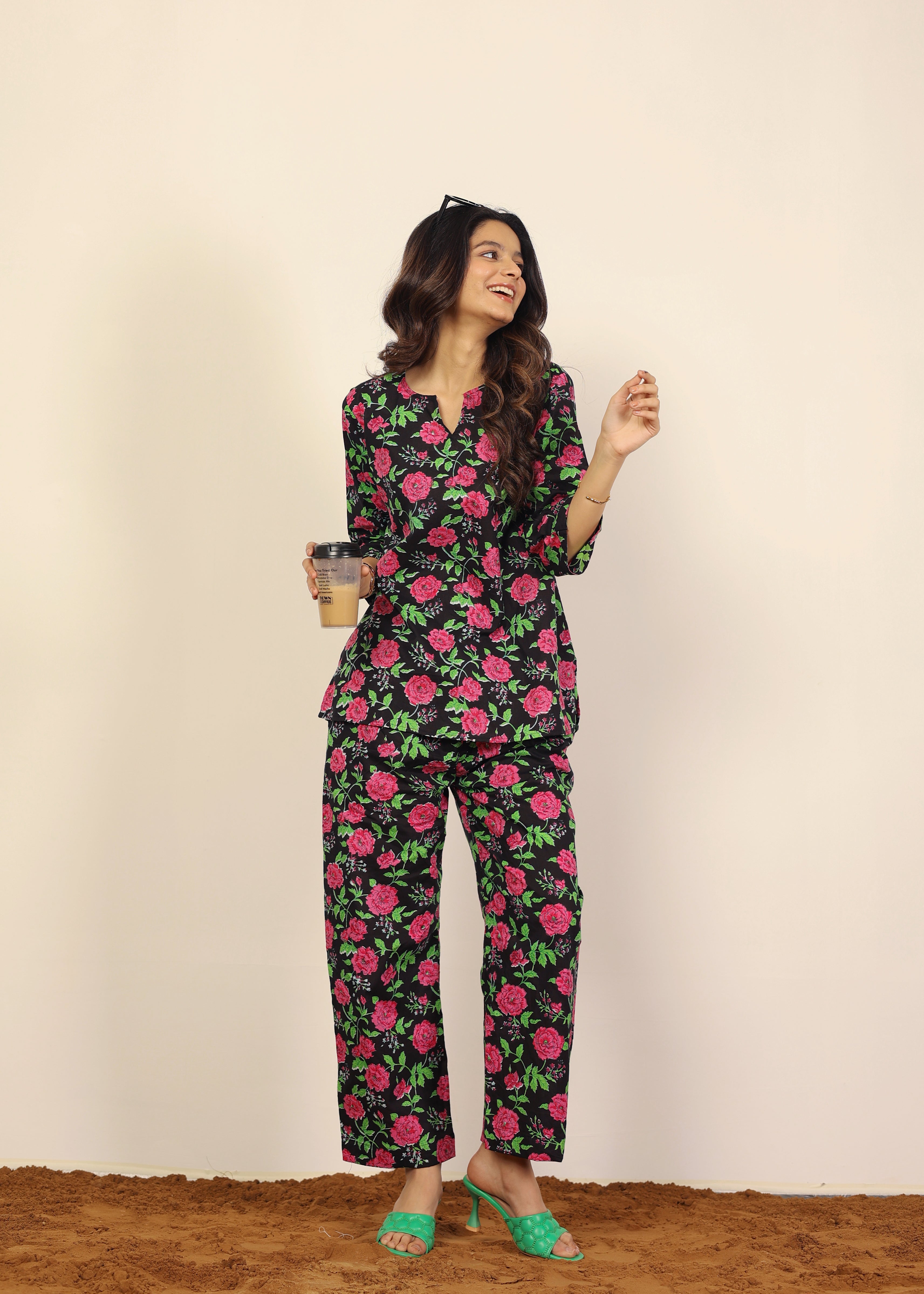• Make a statement with Our black and multi-floral print co-ord set, crafted from pure cotton for all-day comfort. The kurta features a stylish V-neckline