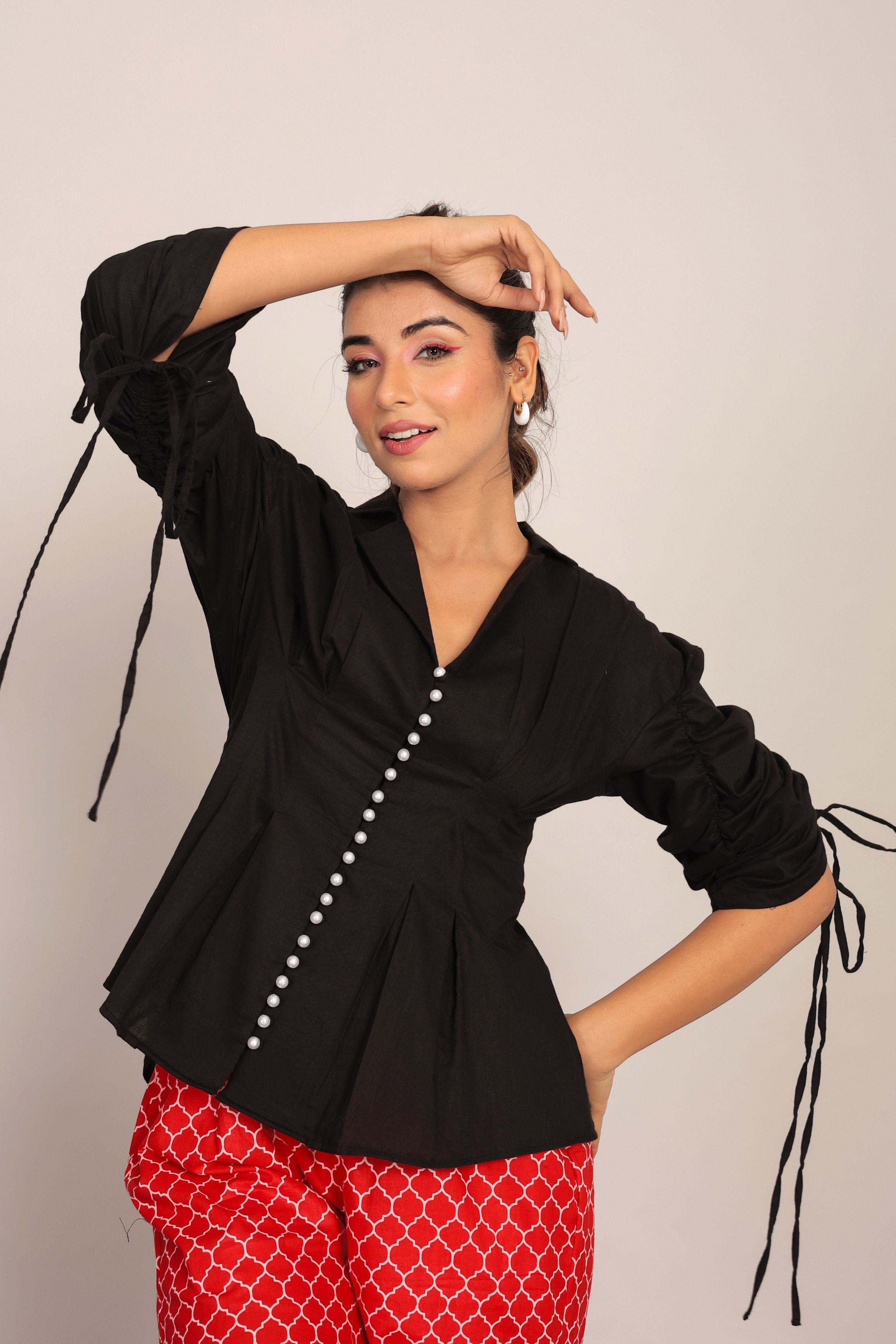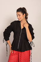 Black Solid Relaxed Shirt with Pearl Button Detail