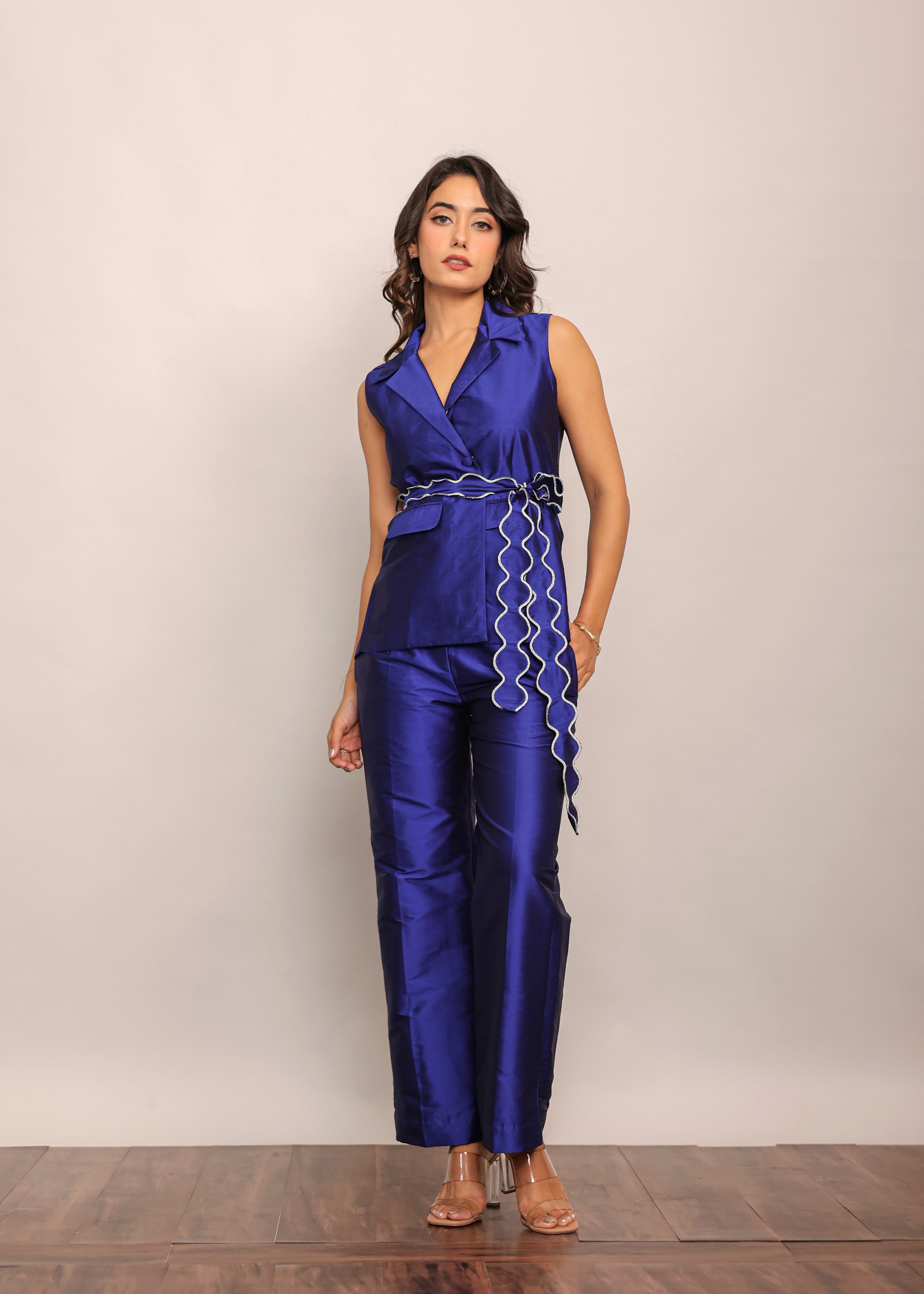 Blue Solid Western Co-Ord Set Top and Pant With Waist Tie Up Belt