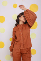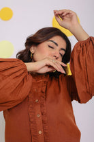Brown Summer Frilled Relaxed Buttoned Formal Linen Shirt