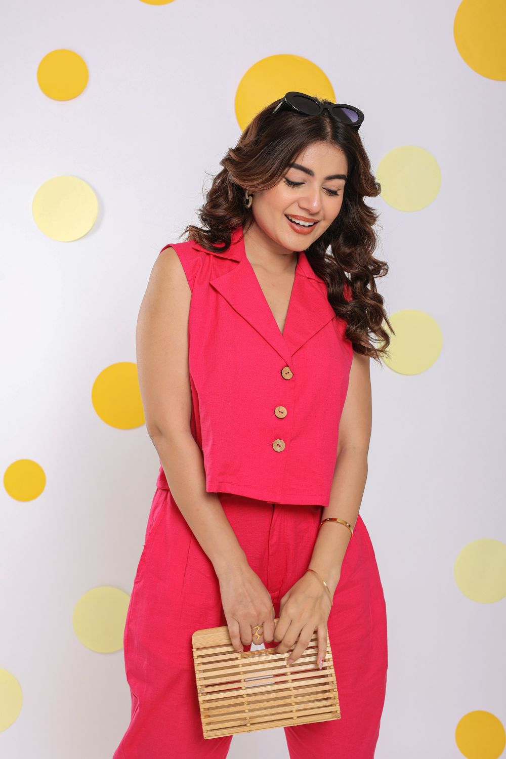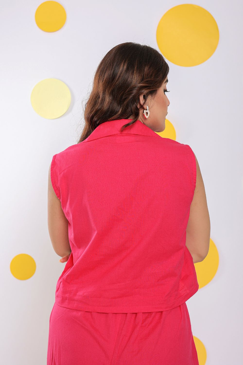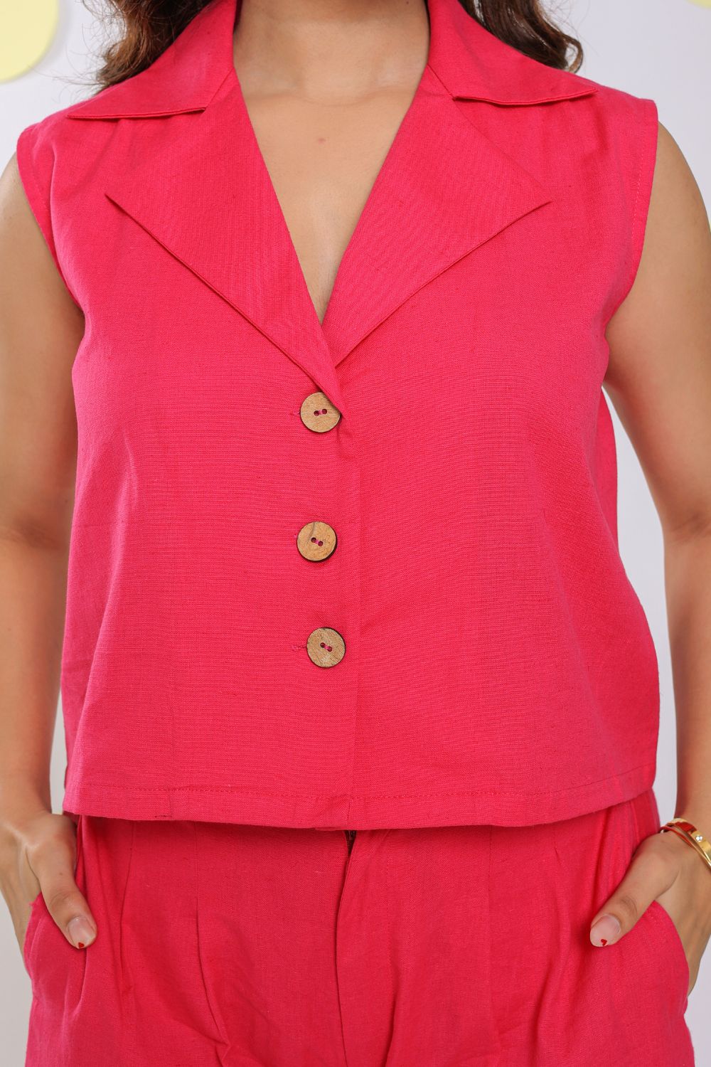 Cotton Hot Pink Summer Sleeveless Relaxed Collared Waist Coat