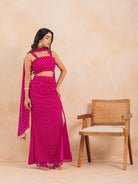 Vibrant, versatile, and effortlessly festive — Elina is a striking fuchsia pink Bandhej multi-styling set designed to give you endless ways to wear and shine. Crafted in flowy georgette, this 3-piece ensemble features a padded blouse, a flared slit skirt, and a 2-meter detachable dupatta, allowing it to be styled as a lehenga, a saree, or a skirt-and-choli co-ord.