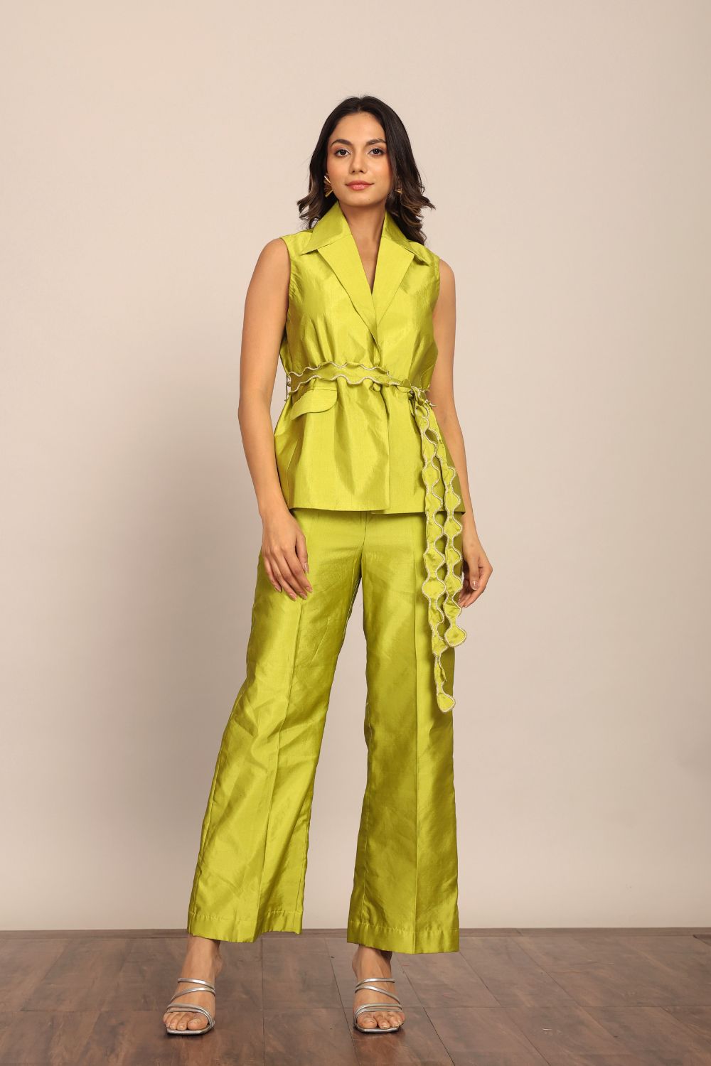 - The solid green hue of the ensemble brings a sense of tranquillity and sophistication, making it a versatile choice for various settings