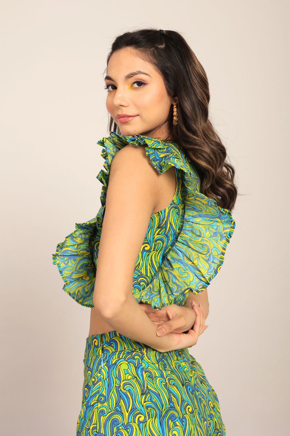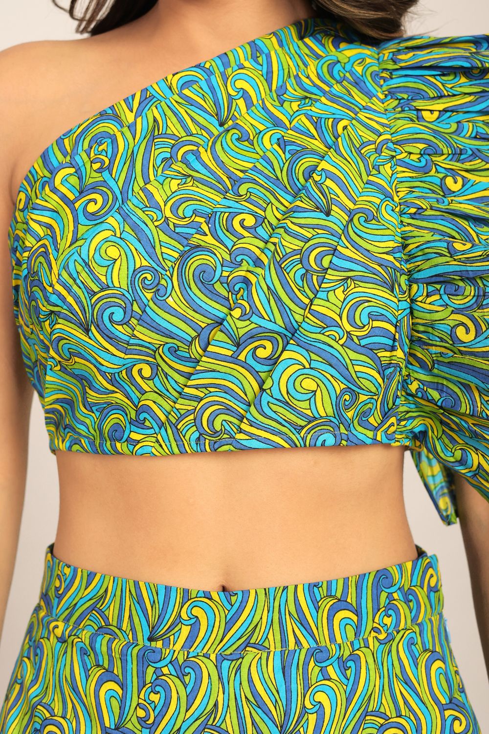- The Green Oasis Geometric top is crafted from breathable cotton, ensuring a comfortable and stylish experience throughout the day.