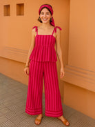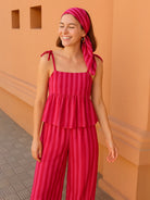 Striped Shoulder Tie-Up Peplum Top with Pants