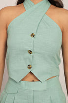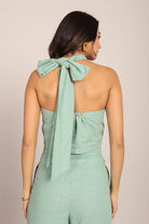 - The solid print of this set offers a timeless appeal, while the halter neck neckline adds a touch of allure, framing your shoulders elegantly.