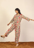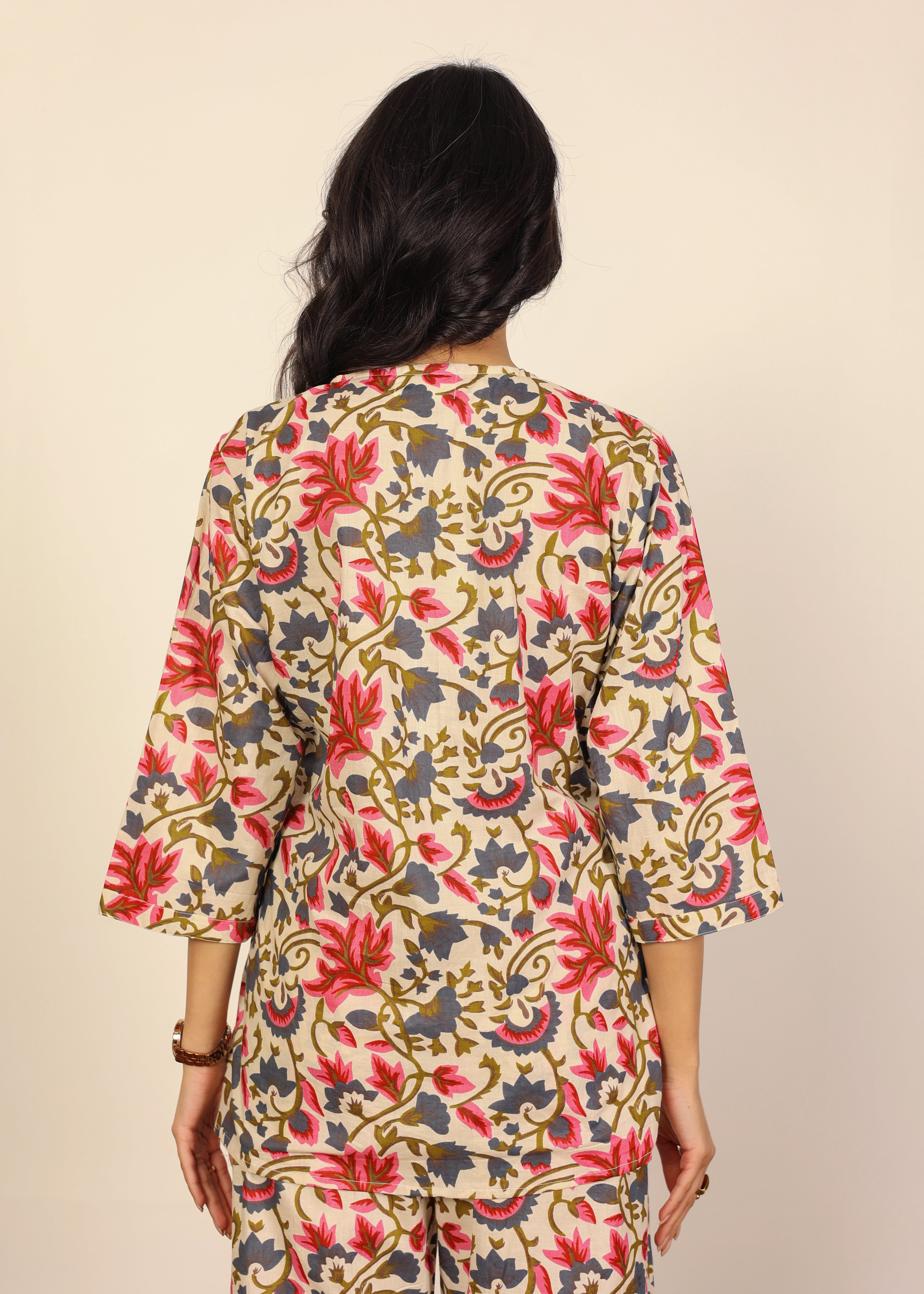 Multicolor Floral Print Two Piece Sets Short Kurta Style V-Neck Top and Straight Pant 100% Cotton Co-ord Set