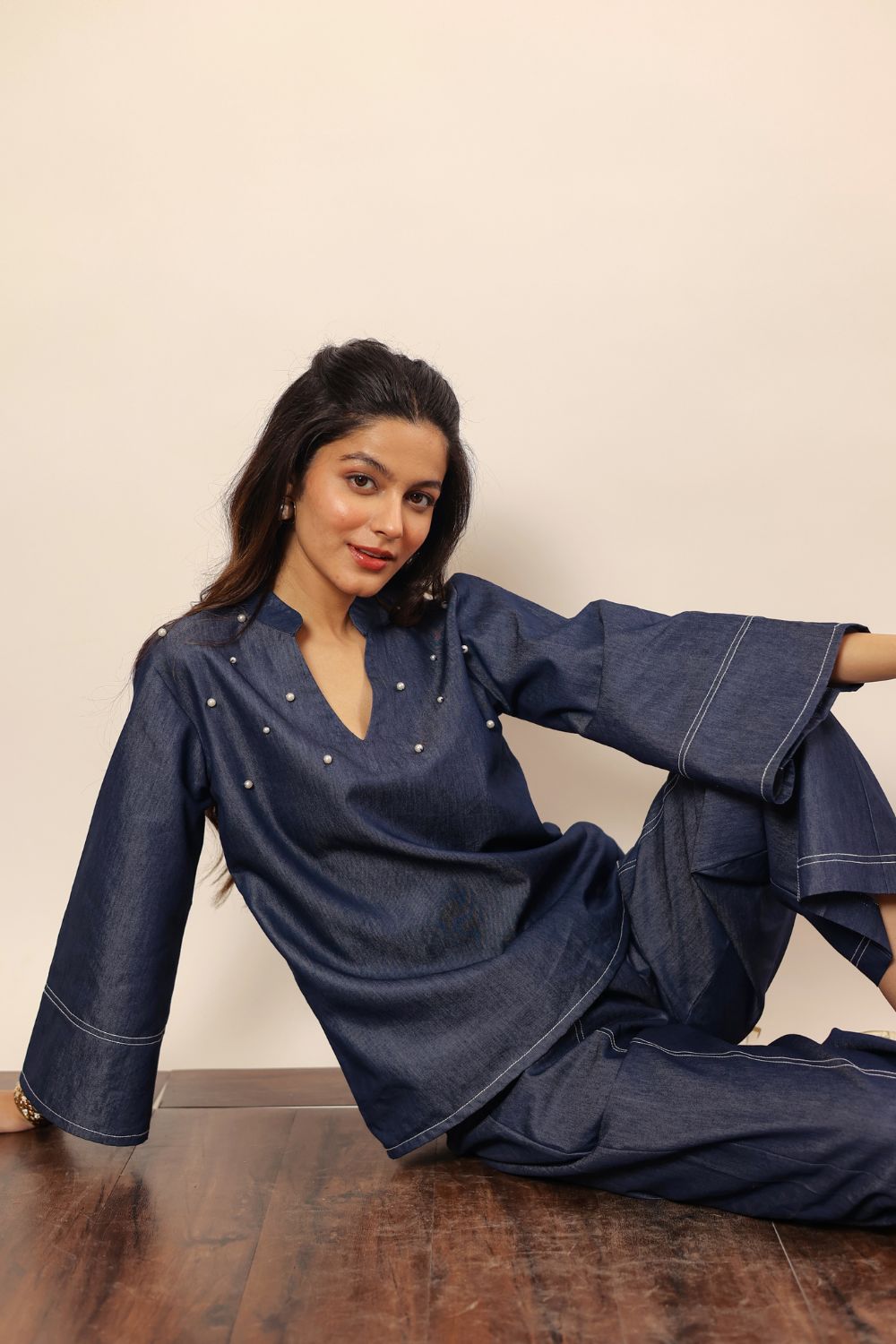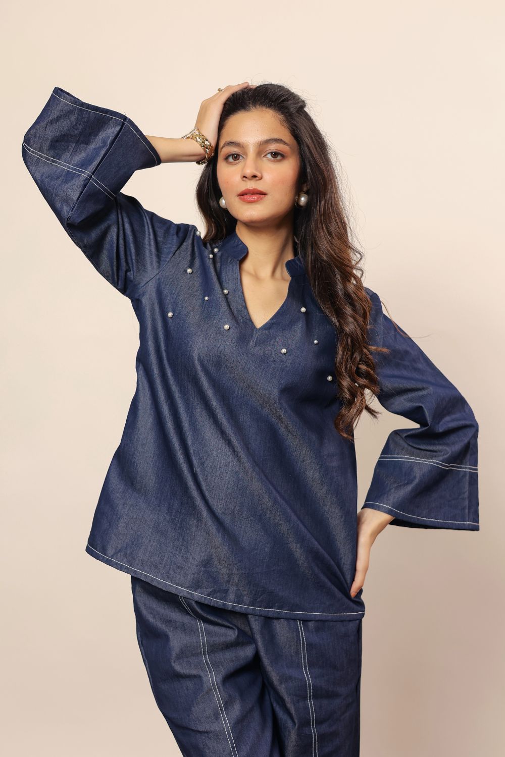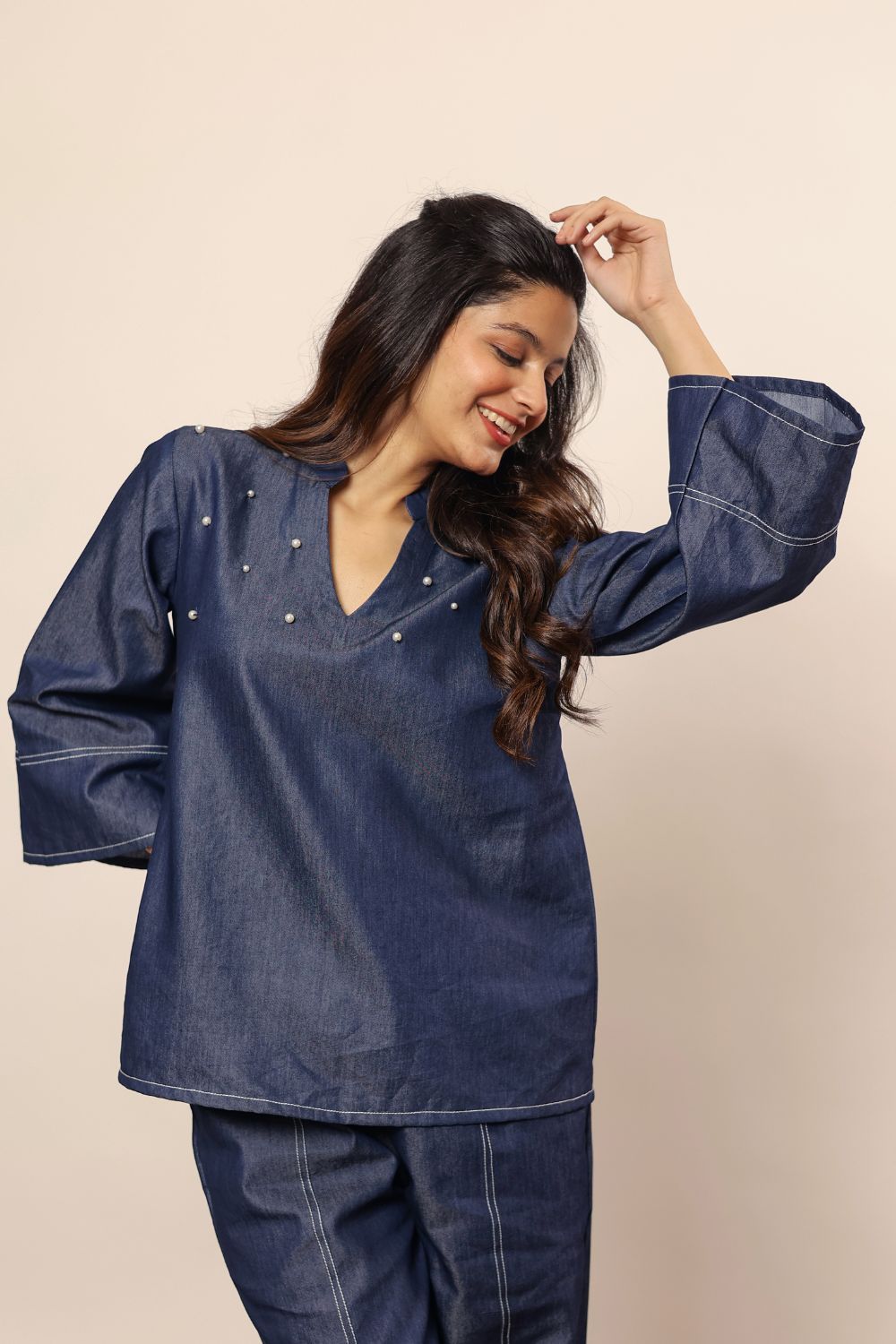 - solid dark blue denim cotton kurta features a classic V-neck design, offering a stylish and modern look. Made from soft, breathable cotton fabric, it