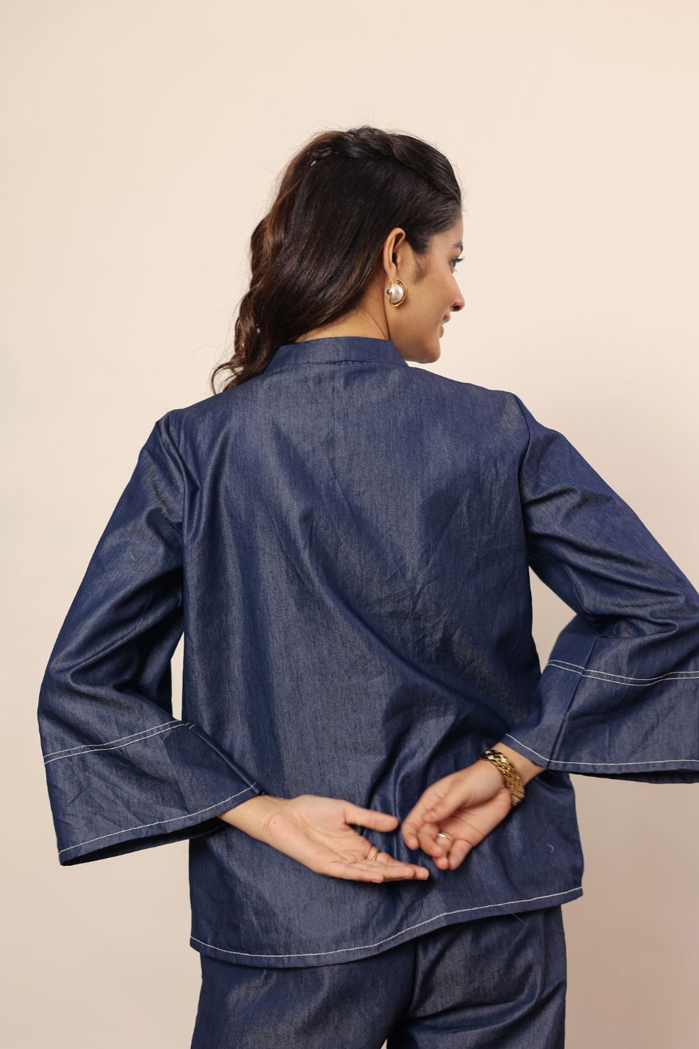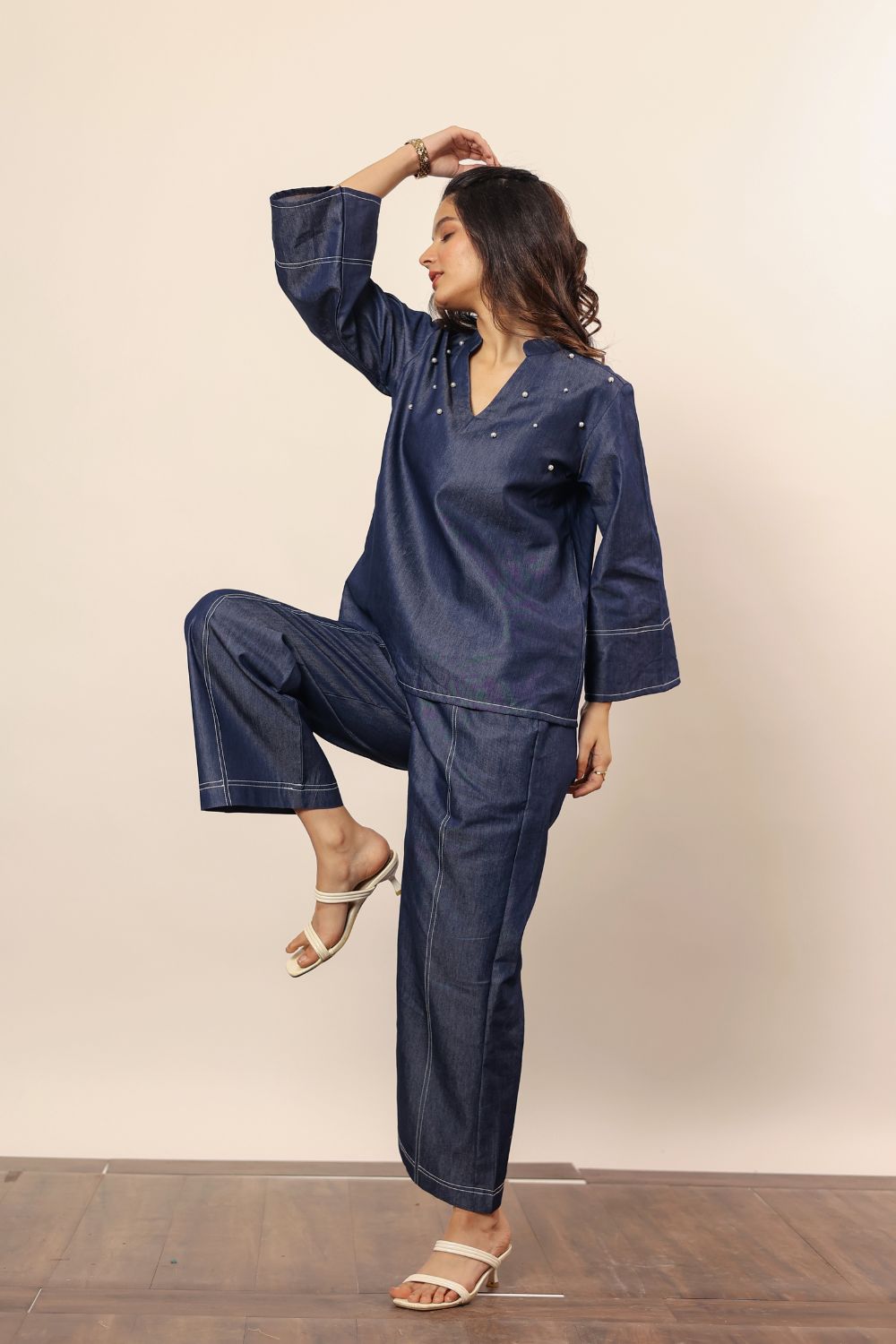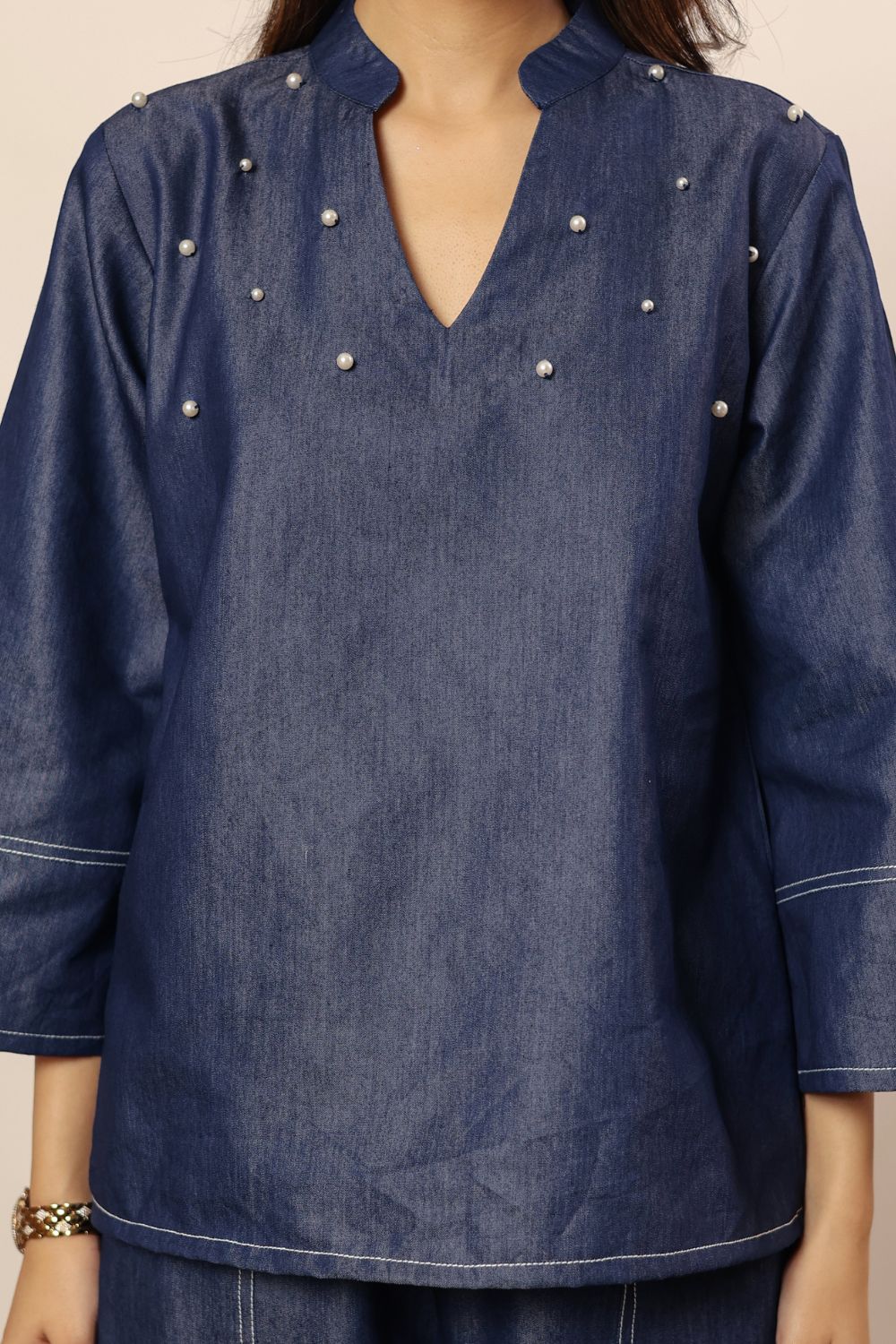 - solid dark blue denim cotton kurta features a classic V-neck design, offering a stylish and modern look. Made from soft, breathable cotton fabric, it