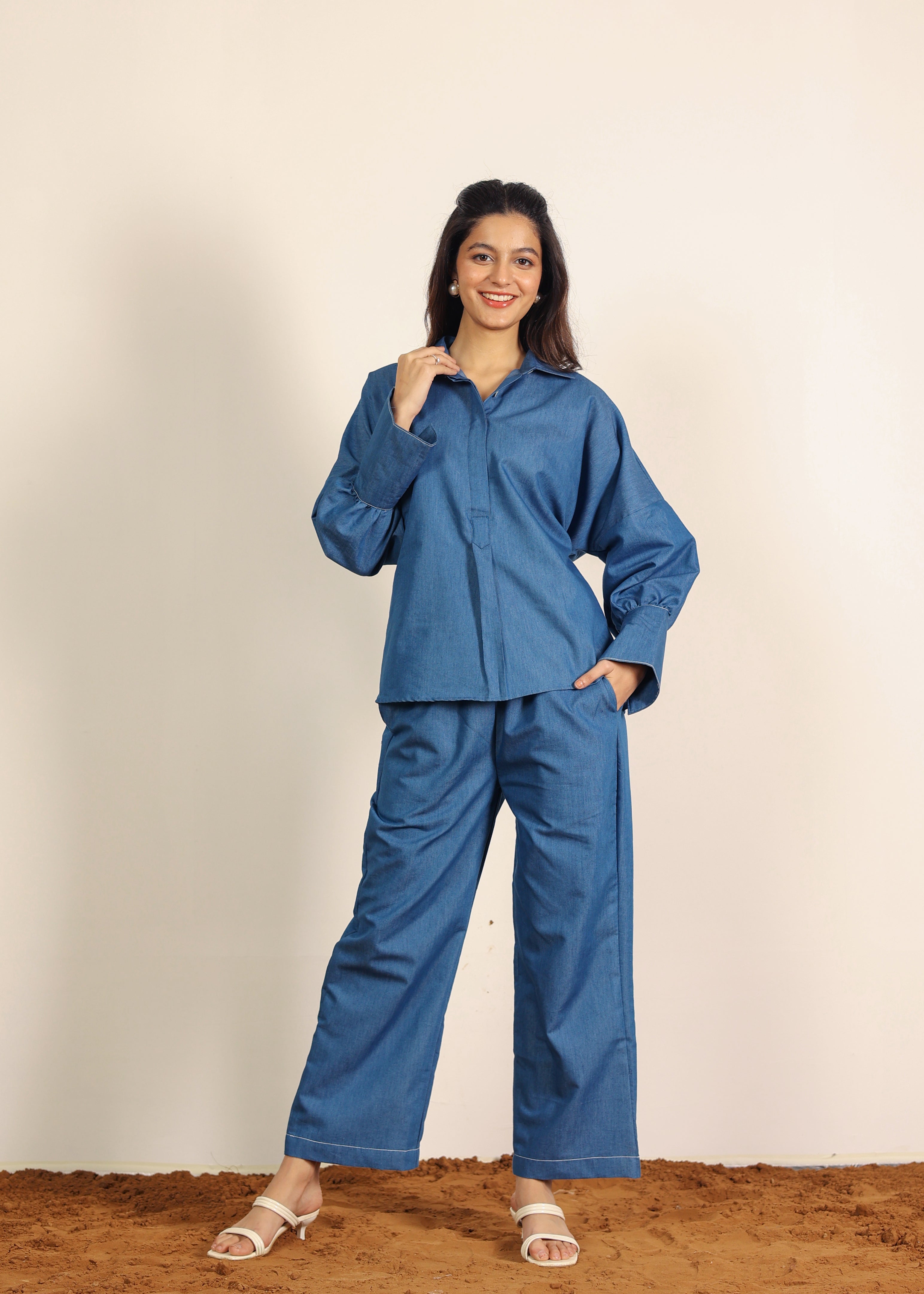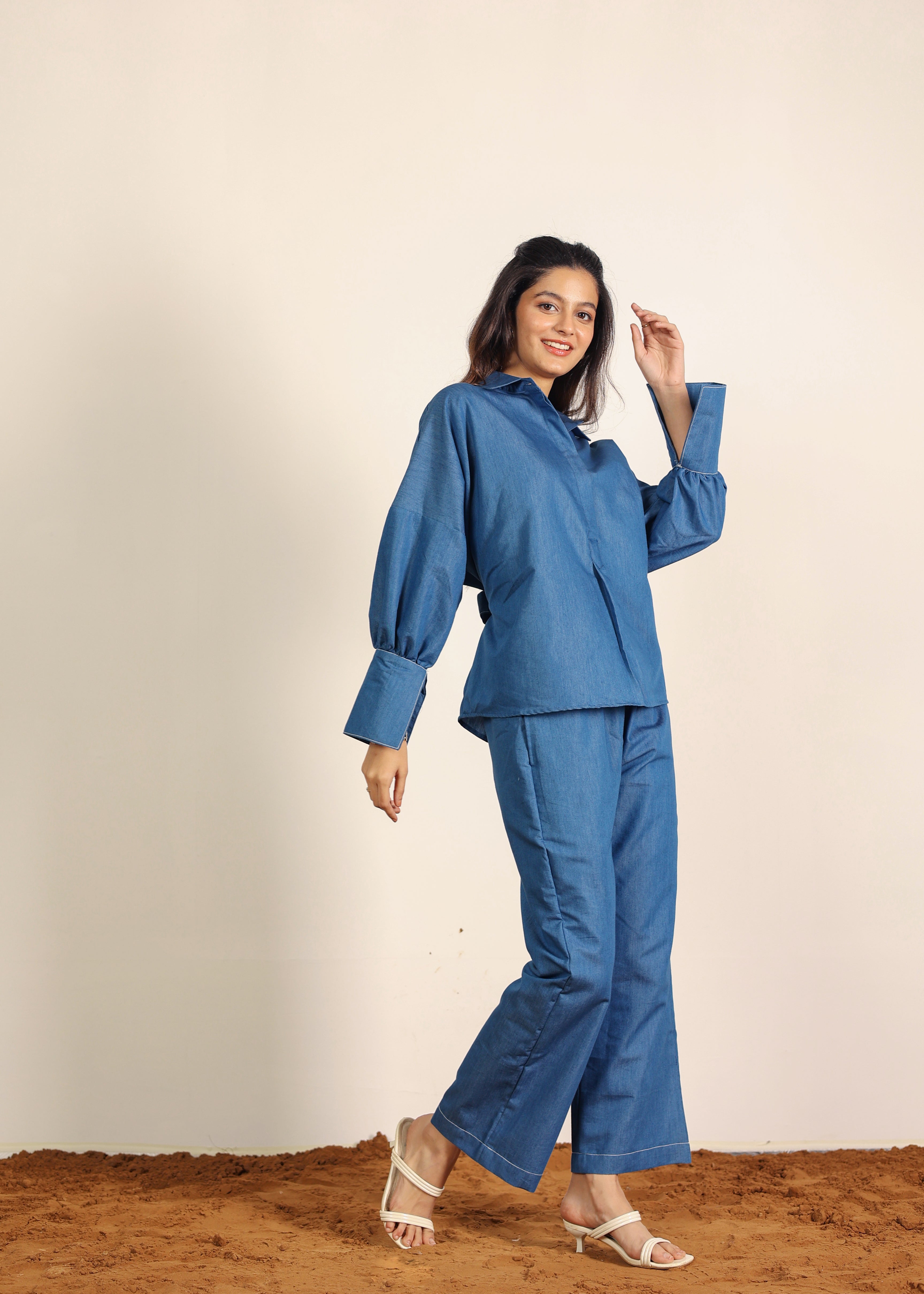 Solid Denim Cotton Two Piece Set Blue Back Tie Shirt and Wide Leg Trouser Airport Relaxed Co-ords