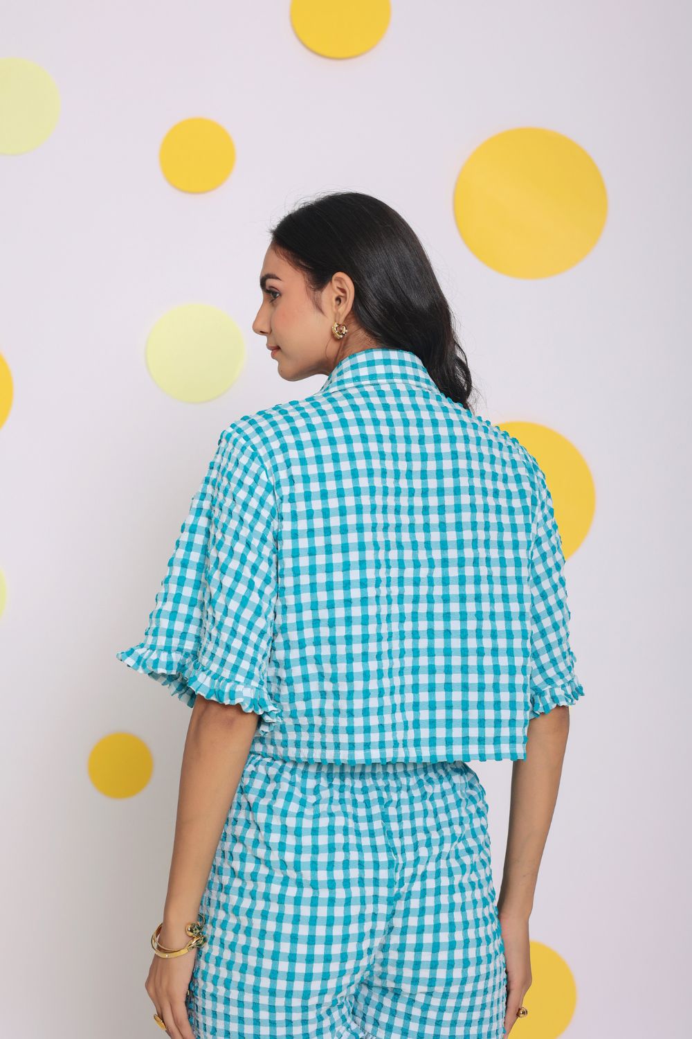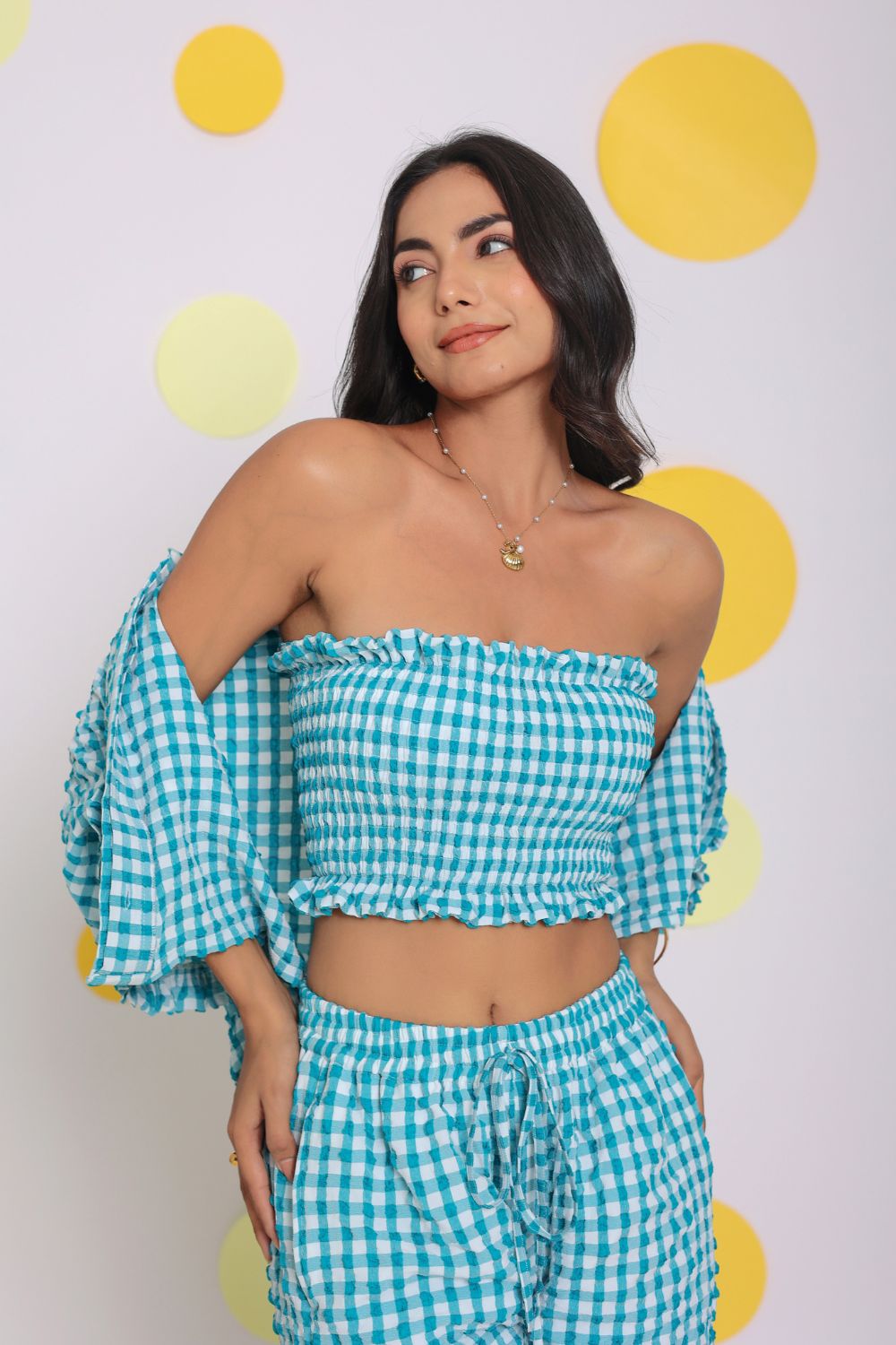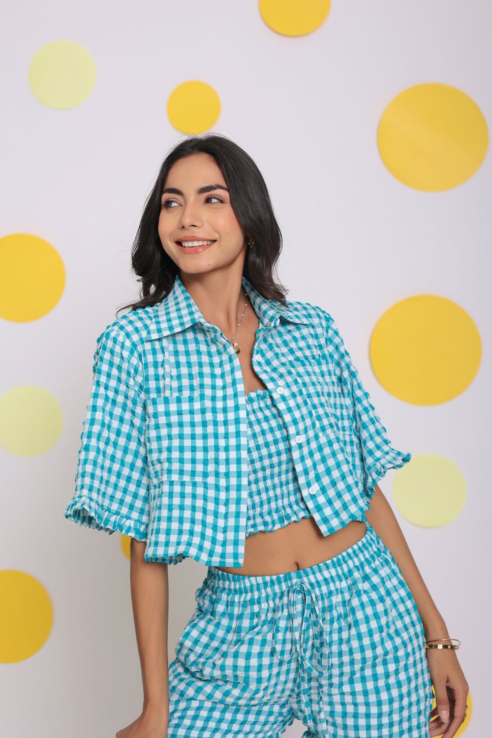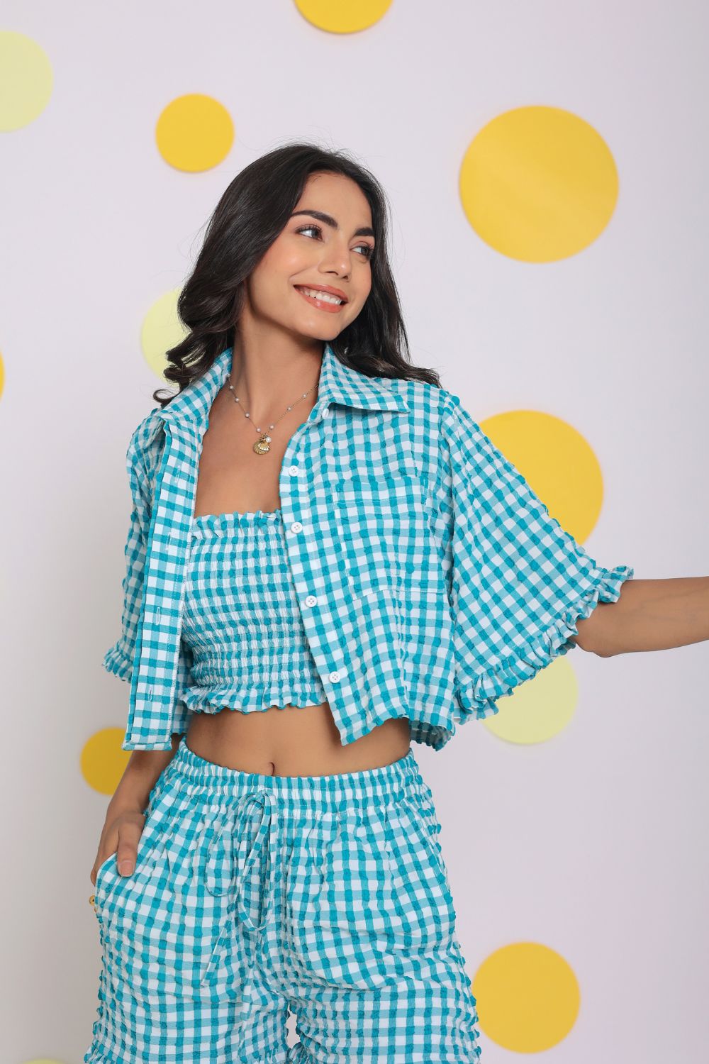 White and Aqua Blue Summer Relaxed Collared Shirt and Fitted Tube Top