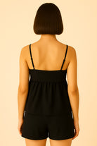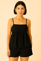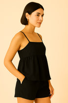 Women Black Cotton Linen Peplum Strap Top with Elastic Waist Shorts Co-ord Set – Holiday, Lounge & Nightsuit Wear