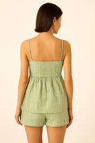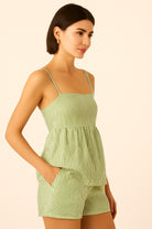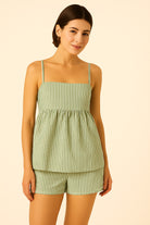 Women Green striped 100% cotton Peplum Strap Top with Elastic Waist Shorts Co-ord Set – Holiday, Lounge & Nightsuit Wear