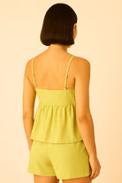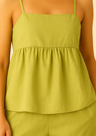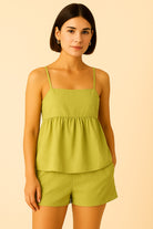 Women Pistachio Cotton Linen Peplum Strap Top with Elastic Waist Shorts Co-ord Set – Holiday, Lounge & Nightsuit Wear