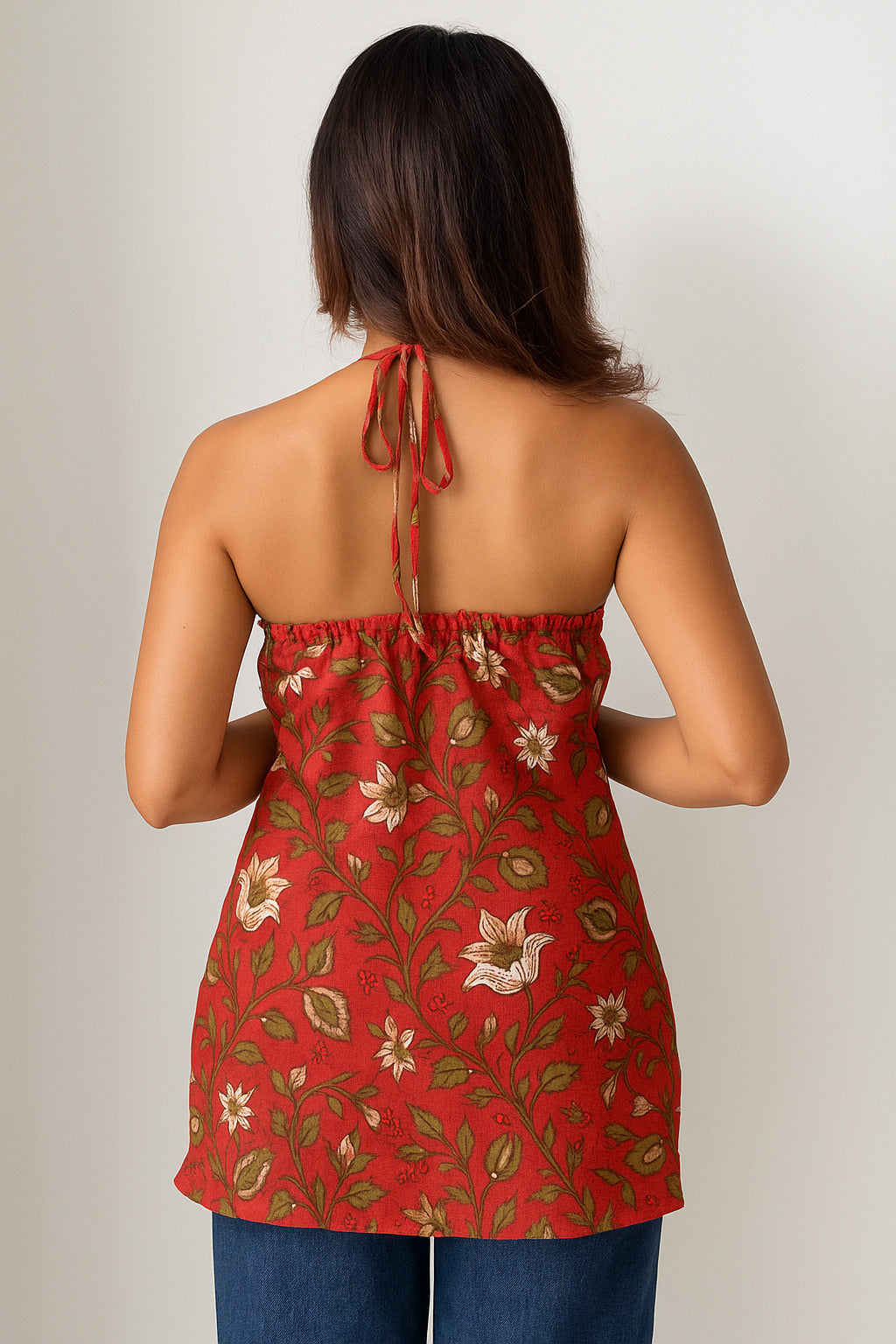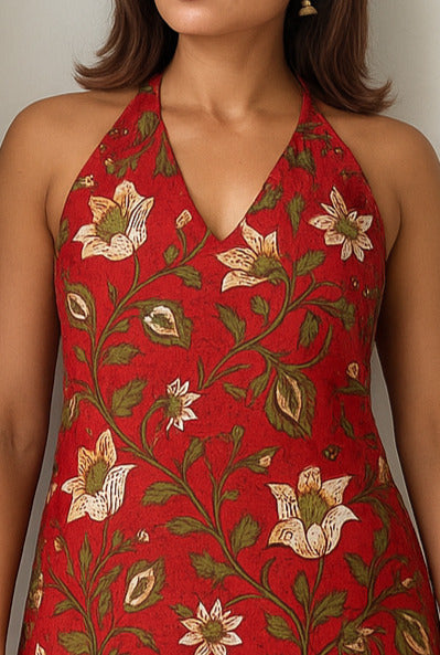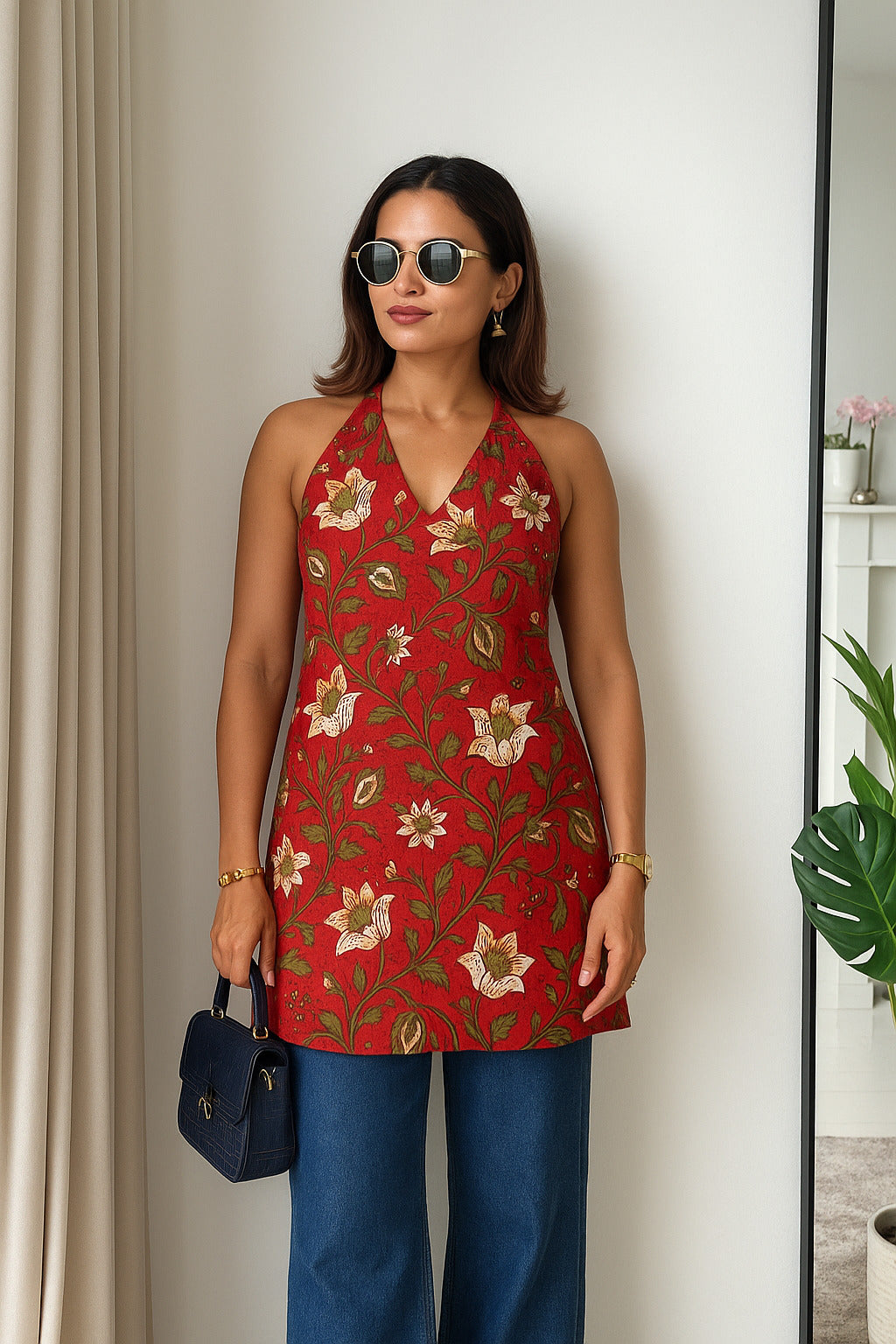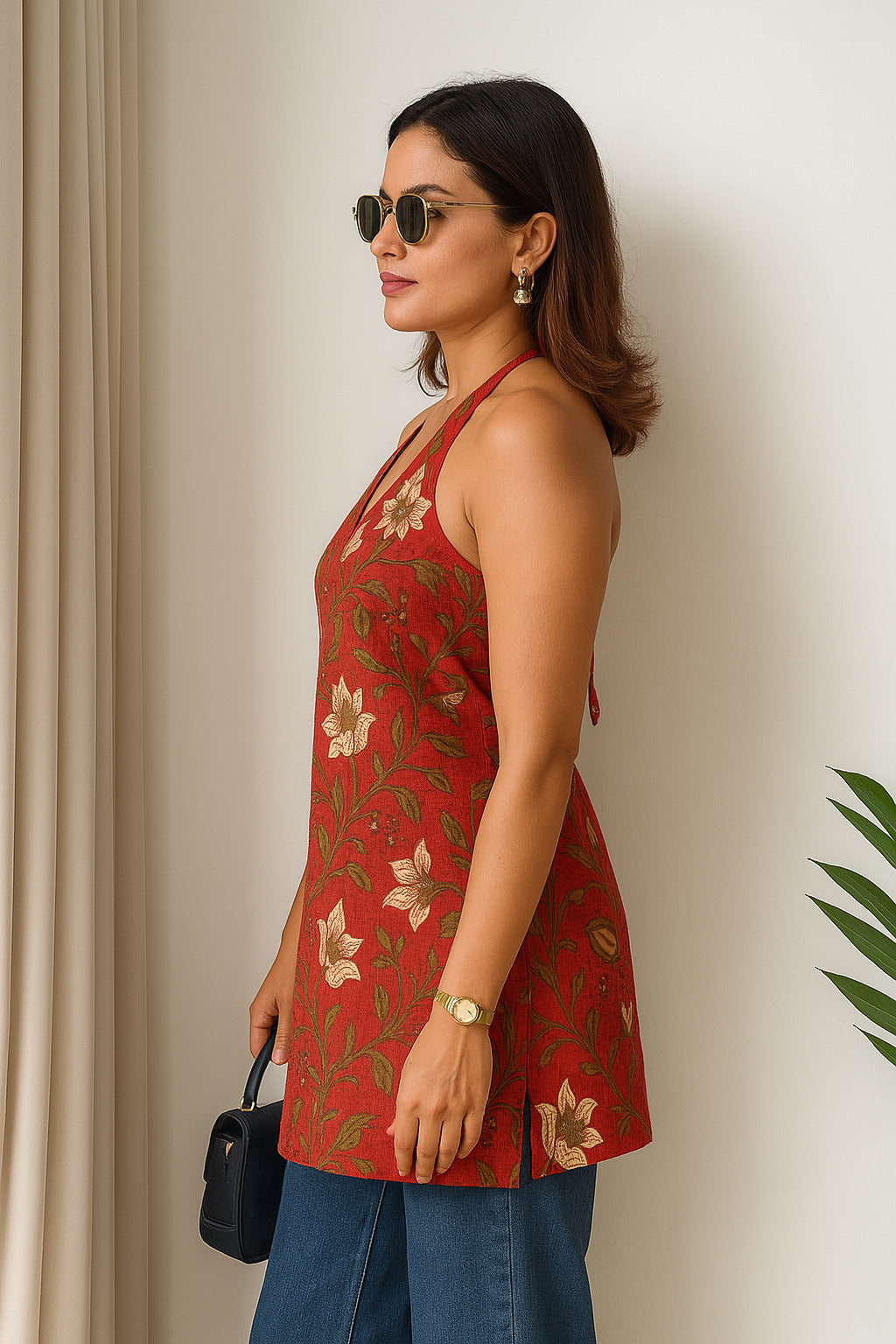 Women’s 100% Cotton Printed Halter Neck Short Kurti – Back Elastic, Side Slits, Tie-Up Neck | Casual Summer Wear