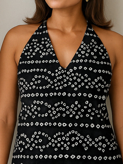 Women’s 100% Cotton Printed Halter Neck Short Kurti – Back Elastic, Side Slits, Tie-Up Neck | Casual Summer Wear