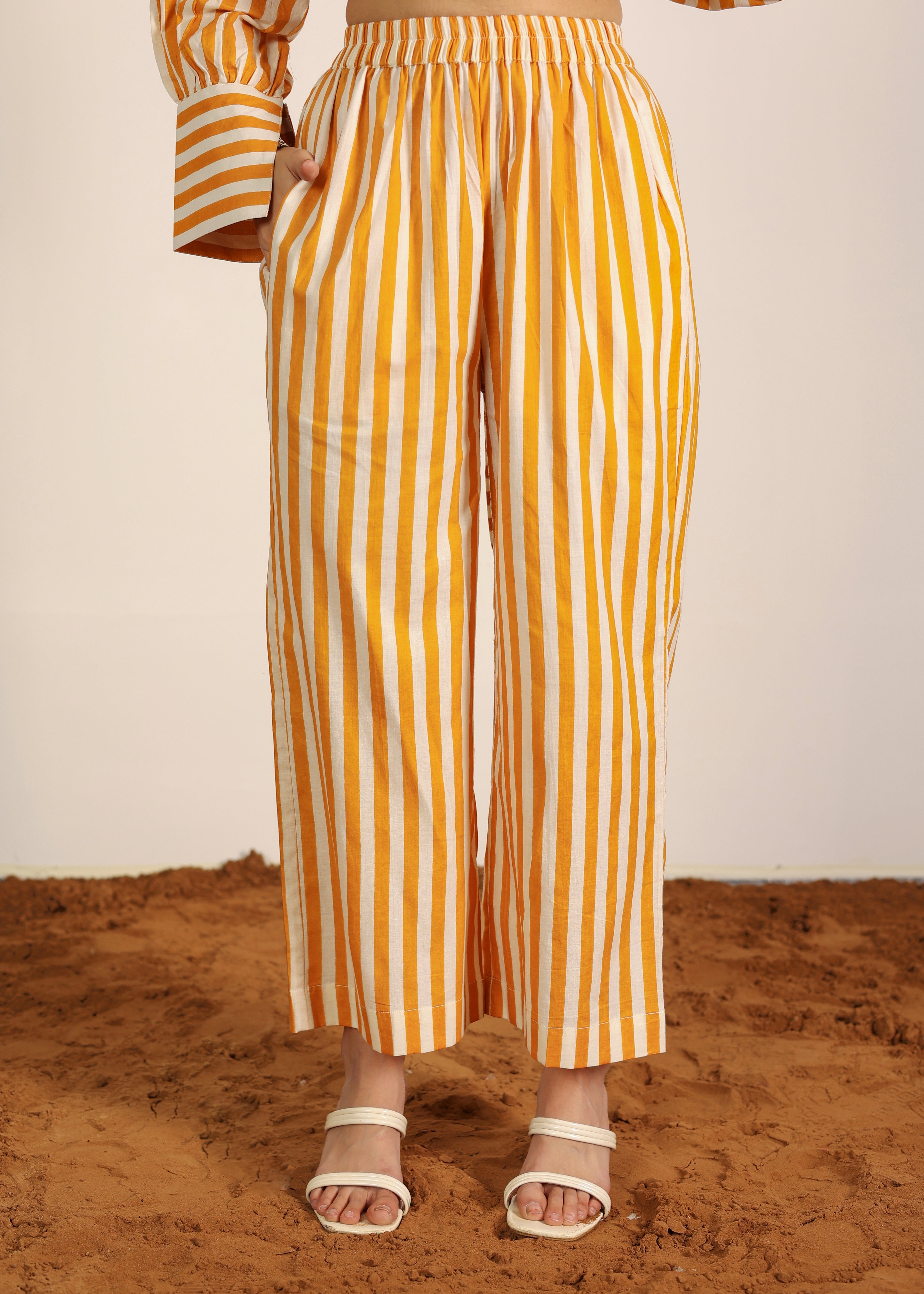 Yellow and White 100% Cotton Textile Print Wide Legs Pants - Stripes Full Elastic Waist Trouser